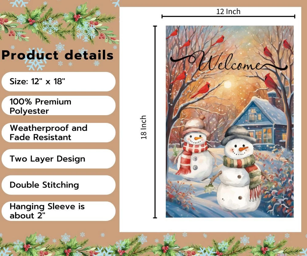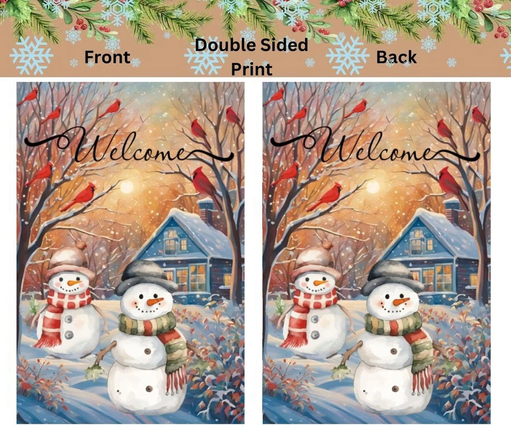 Product Description: Brighten up your winter garden with this charming Snowmen Cardinals Trees Garden Flag. Featuring two playful snowmen adorned in winter hats and scarves, surrounded by trees, bright red cardinals, and softly falling snowflakes, this festive flag is perfect for the holiday season. Made from premium polyester fabric, it offers durability and longevity, ensuring it will be a beautiful accent in your outdoor space for seasons to come. The flag showcases meticulous double sided printing, so the delightful design is visible from every angle. Reinforced with double stitching and a robust two layer construction, it stands strong against the elements. UV protection ensures the colors remain vivid and eye catching, resisting fading even under prolonged sunlight exposure. Key Features: 1. Double Sided Flag 2. Double Stitching 3. Two Layer Design Garden Flag 4. Size 12” x 18” 5. UV Protected/Fade Resistant Premium Polyester Fabric Note: Includes a 12” x 18” garden flag only. Flag stand is Not included. Kindly be aware that manual measurements may lead to minor differences.