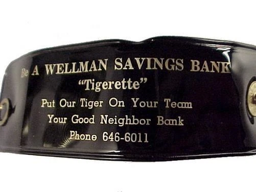Vintage Collectible Usable Rain Hat in Vinyl Sleeve with Snap. Shiny Black Vinyl Sleeve with Gold Lettering and Tigerette Tiger patterned Rain Hat. Says: Be a Wellman Savings Bank "Tigerette". Pur Our Tiger On Your Team. Your Good Neighbor Bank plus Phone # without Area Code. Vinyl Sleeve Measures 1 3/8 inches H. Looks Brand New. Never used. Shiny with perfect lettering. Price is for one. No 90598 Questions? Please use the “Contact Seller” link and we will do our best to help you. Vintage Collectible Usable Rain Hat in Vinyl Sleeve with Snap. Shiny Black Vinyl Sleeve with Gold Lettering and Tigerette Tiger patterned Rain Hat. Says: Be a Wellman Savings Bank "Tigerette". Pur Our Tiger On Your Team. Your Good Neighbor Bank plus Phone # without Area Code. Vinyl Sleeve Measures 1 3/8 inches H. Looks Brand New. Never used. Shiny with perfect lettering. Price is for one. No 90598 Questions? Please use the “Contact Seller” link and we will do our best to help you. To see more Advertising in our eBay Store Click Here To see more Souvenirs in our eBay store Click Here Don’t miss the MAKE US AN OFFER section in our eBay store Click Here To see the variety we carry in our eBay store Click Here Item will ship next business day after receiving payment. BUYERS OUTSIDE THE US, Please Note: International Buyers are responsible for any and all import taxes, duties or fees incurred in your country. Please do not confuse them for Additional Shipping Charges from us. United States and International Government Regulations prohibit marking merchandise below value or as Gifts. Attention Sellers - Get Templates Image Hosting, Scheduling at Auctiva.com.
