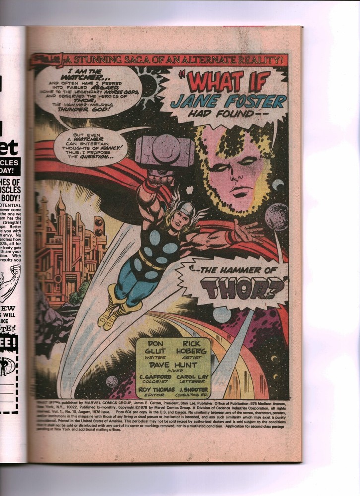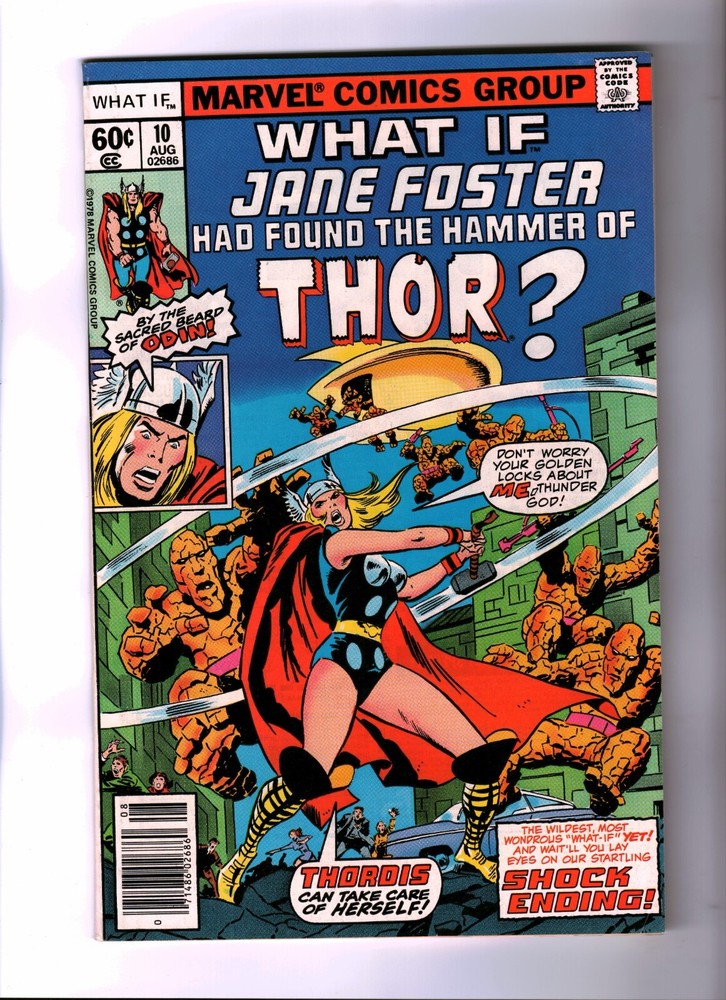 U. S. Bidders ONLY for this item. No International Shipping. WHAT IF? #10 featuring WHAT IF JANE FOSTER HAD FOUND ... THE HAMMER OF THOR? Graded Near Mint- August 1978 Marvel Comics - Bronze Age Written by Don Glut Illustrated by Rick Hoberg and Dave Hunt Cover illustrated by John Buscema GIANT 52 Page Issue Overstreet Comic Book Price Guide Value in THIS condition $190.00 * * * * * * * THE GENERATIONS COLLECTION FLAGSTAFF, ARIZONA The Generations Collection is an original owner comic book collection compiled over 8 decades by 3 generations of the Gipson family. This nearly 40,000 issue collection contains comics from 1940 to present day. Note: Not all of the comics that we sell are from the Generations Collection. Generations Collection comics can be identified by an ORANGE grading sticker on the upper left corner of the comic storage bag. All Golden, Silver and select Bronze Age comics from the Generations Collection come with a signed and serialized Certificate of Authenticity. All packages are insured for up to $100.00 at no additional charge. If you desire additional coverage, contact the seller before making payment. All comics and magazines come individually bagged and boarded. Shipped in padded envelopes & sandwiched between 4 pieces of cardboard. MAXIMUM U.S.A. SHIPPING IS $8.95 NO MATTER HOW MANY COMICS YOU BUY! (Excludes CGC & PGX Graded Comics) I will combine shipping costs for winners of multiple auctions. Combined shipping costs apply to auctions won during the SAME calendar week. U. S. Bidders ONLY for this item. No International Shipping. Track Page Views With Auctiva's Counter