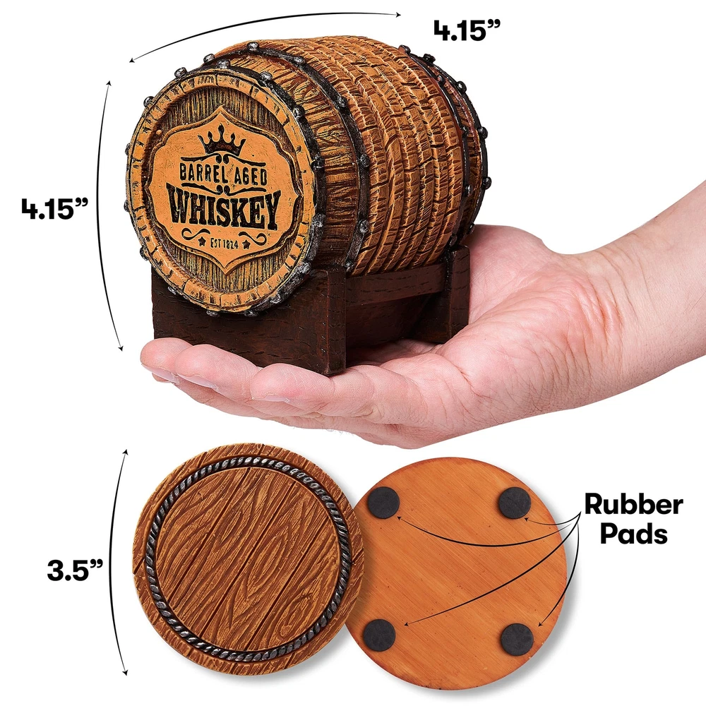 🥃 Handcrafted Whiskey Barrel Coasters – 100% crafted and painted by hand, each piece is unique and made with love. This set will enhance your home with functional whiskey barrel decor that brings a smile to your face. 🥃 SIX (6) Full-Size Rustic Coasters – Other whiskey coaster sets come with 4 coasters, but ours includes 6 coasters so you can entertain even more guests and accommodate more friends! Our coasters are larger than others, 3.5-inch diameter, to fit all size cups and mugs. 🥃 Makes the Whiskey Lover Gift – Our beautiful whiskey barrel coaster set makes the perfect gift for whiskey lovers, or anyone who just wants to enhance their bar or man cave decor. 🥃 Won't Warp Over Time – Our whiskey coasters are made from fully handcrafted durable resin, instead of poorly-absorbing cork, so they will not warp or deteriorate over time. 🥃 Non-Slip Pads to Protect Your Furniture – High quality non slip rubber pads on the bottom of our whiskey barrel holder and each individual coaster are included to prevent slipping or scratching.
