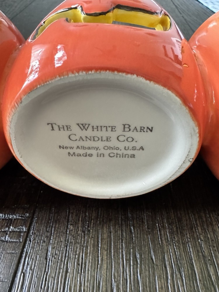 This vintage White Barn Orange BOO Jack O' Lanterns Pumpkin 4 Votive Candle Holder is a medium-sized ceramic and porcelain piece, featuring a retro style with a high gloss finish. Hand-painted in orange with a pumpkin pattern, this candle holder is suitable for multiple votive candles and mini candles. It measures 13 inches in length and 3-4 inches in height, making it a perfect addition to any room during the Halloween season. Made in China in the late 20th century, this unboxed candle holder adds a festive touch to your holiday decor.