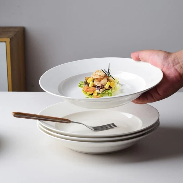 Features: 1. Material: Ceramic 2. Color: White 3. Dimensions: outer diameter -23.5cm/9.5in, inner diameter -16.9cm/6.7in, depth -4.5cm/1.8in 4. Capacity: Full capacity -600ml/21oz, half capacity -300ml/10.5oz 5. Single weight: 0.88 pounds/0.4 kilograms Package:6 x plates