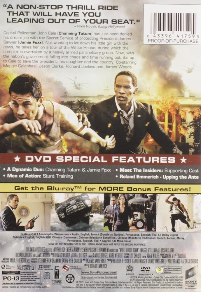 Product Description Capitol Policeman John Cale (Channing Tatum) has just been denied his dream job with the Secret Service of protecting President James Sawyer (Jamie Foxx). Not wanting to let down his little girl with the news, he takes her on a tour of the White House, when the complex is overtaken by a heavily armed paramilitary group. Now, with the nation’s government falling into chaos and time running out, it's up to Cale to save the president, his daughter, and the country. Now this is what we want in a President of the United States: wisdom, humor, and the ability to wield a rocket launcher while hanging out of a limousine traveling at high speed. Welcome to the giddy world of White House Down, Roland Emmerich's absurd but hugely enjoyable thriller, in which President Jamie Foxx and other members of the government are taken hostage in a nefarious plot. Only security guy Channing Tatum, who happens to be on the White House tour with his daughter while the assault happens, stands in the way of disaster. Emmerich's weakness for glib one-liners coming right after mass destruction remains intact, and this movie is not great art. But it's genuinely suspenseful for much of its 130-minute running time, and Foxx and Tatum appear to be having good fun. The rest of the cast is impressively credentialed, too, including Maggie Gyllenhaal and James Woods as Secret Service veterans and Richard Jenkins as the Speaker of the House. Released a few months after Olympus Has Fallen, a film with a very similar plot, White House Down didn't connect with audiences. But it's the better movie of the two, a popcorn-muncher if ever there was one. --Robert Horton You Can CHOOSE WITH OR WITHOUT A CASE USE THE drop-down box to choose the MOVIE with or without the plastic case Choose with the Case and we ship by MEDIA MAIL with tracking Choose without the Case and we ship by First Class Letter Mail (no tracking) Both options include the MOVIE and the Cover Art You get combined shipping by MEDIA if you buy more than four items at a time We are forced to charge 75 cents per item because of recent large US MAIL rate Increases