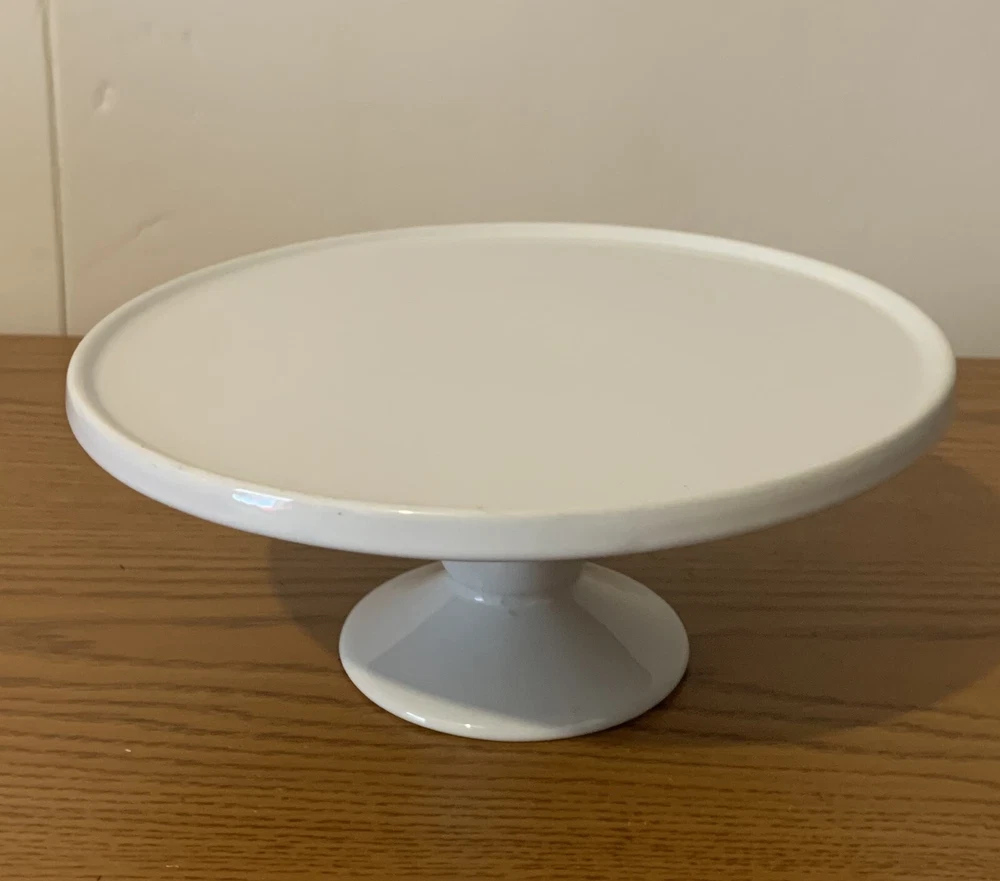 The product is a White Porcelain Cake Stand measuring 9" wide. Made of porcelain, this cake stand has a clean and elegant appearance, perfect for displaying and serving cakes or other baked goods. The white color adds a classic touch to any table setting, making it ideal for special occasions or everyday use. Its sturdy construction ensures stability while showcasing your desserts in a stylish way.