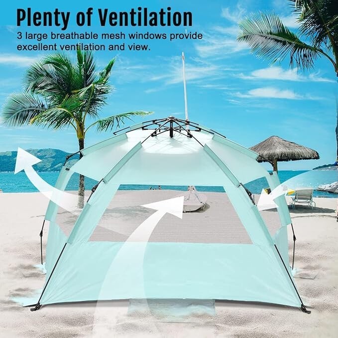 About this item Polyester Blend Larger Space at a More Affordable Price enough space for 2 adults plus 2 kids Easy Set Up with Stability Accessories & Easy to Carry - Quick popping mechanism allows to set up in seconds! Includes 5 attached sandbags, 6 steel stakes, 6 sand stakes & tiedown strings to provide more stability; lightweight and easy to fold back with a compact carrying bag for easy transport and storage Outdoor Protection & Great Ventilation - Premium 210t sun-proof material plus a special embedded silver-coated material to provide great UV protection from the sun and 3 added roll up openings maintain airflow to keep the tent cool when staying inside Privacy Option - An extended front floor provides extra space for more activities and can be closed with adhesive Velcro straps when private moment protection is needed, such as breastfeeding or clothes changing