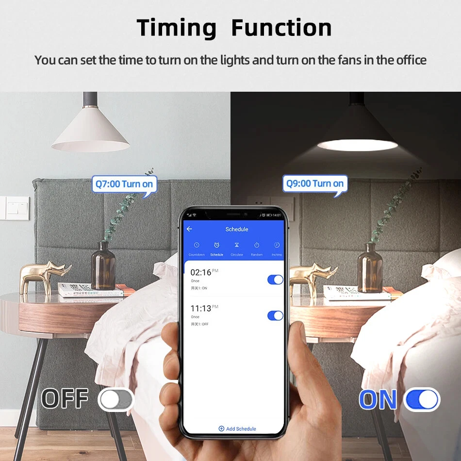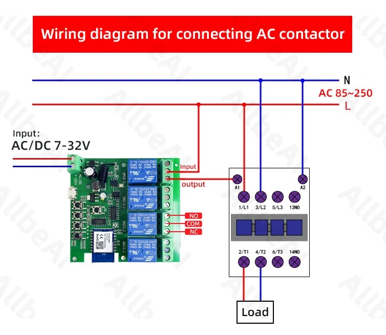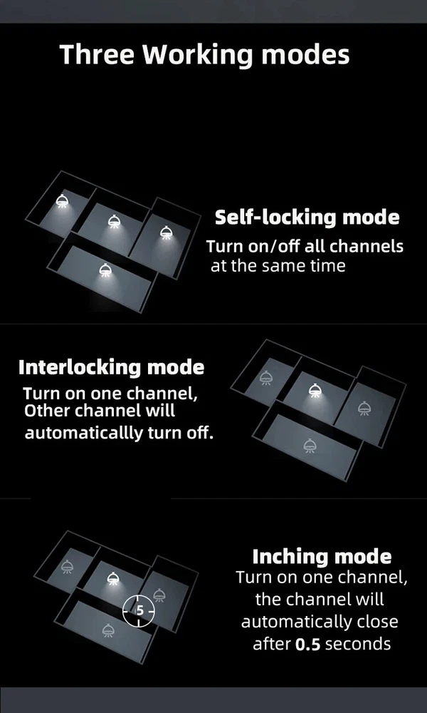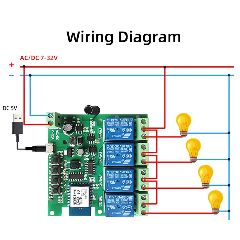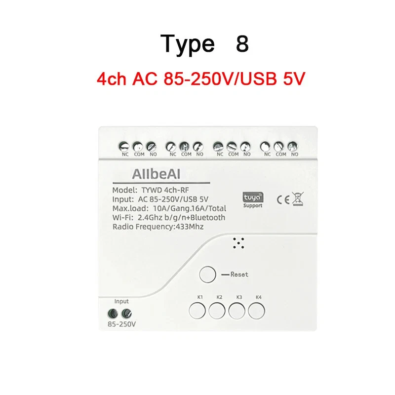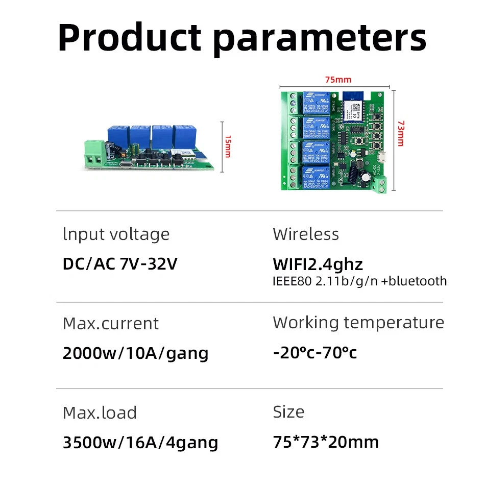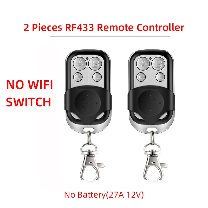 Package Listing Type 1: 4 Channel Wifi RF433 Relay Type 2: 4 Channel Wifi RF433 Relay+RF433 Remote Controller Type 3 : 4 Channel Wifi RF433 Relay+Case Shell Type 4: 4 Channel WIFi RF433 Relay+Case Shell+RF433 Remote Controller Type 5: 2 Pieces RF433 Remote Controller,no wifi relay Type 6 2 Pieces RF433 Remote Controller,no wifi relay Use For 1.Remotely give a pulse signal to turn on and turn off Lights,Lamps and other home appliance. 2.Remotely give a pulse signal to turn on and turn off Garage Door,Door Access 3.Remotely give a pulse signal to control DC Motor,AC Motor to Forward and reverse Overview Type 1,2 The RF433 remote controller (receiver) don't include battery battery type;27A 12V,The picture of the battery is in the end of the page. The WIFI module can be controlled by fix code EV1527 RF433 remote controller,and it can't controlled by rolling code remote controller. Note The relays is passive output(dry contact), No matter how many power you supply in the input, the output don't have any voltage, you also need to supply power in output. The power supply in the input just can make PCB board work.if you do not supply power in output, the connectted device can't work. 3 Working Modes 1.Self-locking : each channel could be switched on/off seperately.You also can turn on/turn off all channel at the same time. 2.Interlocking mode : Switch on any channel , other channels will be switched off automatically . 3.Inching mode(jog mode) : Switch on one channel,the channel will be automatically closed after 0.5 seconds .Other channel is same as the channel. If you need to change the mode,you need to press the mode button or active other working mode in the app. How to Change the Inching Time If you need to change the inching time. You need to press the mode button to enter into self-locking mode or interlocking mode,so you can change the inching time on the APP. The inching time only available in the self-locking or interlocking mode) The time range is 2-3600 seconds. Features: 【Two Input Ports】 You could choose USB 5V port or the screw terminal port to supply power in the input to make the pcb board board work. 【Dry Contact/Passive Output】 No matter the power you supply in the input, the output don't have any voltage If you do not supply power in output port, the connectted home appliance can't work, you also need to supply power in output. 【Timer】 The connectted home appliances can be automatically turned on/off according to the time schedule. Each channel can set different time schedule. Different Ways to Control the WIFI Module 【APP Remote Control】 You can control the connectted home appliance in Tuya or smart life APP anywhere and anytime.Such as light, electric kettle, electric rice cooker, electric curtain, etc. 【RF433 Control】The WIFI Module support RF433 Frequency,and you can control the WIFI module by RF433mhz remote controller. 【 Mobile Phone Control】 When you go outside or at home,You could control the module in your smart phone by 2.4Ghz WIFI or 2G/3G/4G Mobile Network. (Note:The router need to online and the WIFI module need to keep a close distance with the router) 【Voice Control 】 Compatible with Alexa and Google Assistant, you can use the voice control to turn it on/off the connectted home appliances . 【Share Control】 One device can control by Multiple phones,you can share the wifi module with your family member. 【Group Control】 one phone can control Multiple smart device.You can add the wifi module and other smart device in a group,and then turn on/off all smart device at the same time. 【Scene Linkage】 Creating smart scene to trigger ON/OFF all WIFI smart home appliances by departure mode, home mode, temperature, humidity, or other conditions. Description: Input1: USB 5V Port Input 2 :(screw terminal port): DC/AC 7-32V Output:Passive Output(Dry contact) Working frequency: 50-60Hz RF433 Frequency Working temperature: -20-70℃ Wifi standards/ protocol :IEEE 802.11b/g/n, WIFI 2.4Ghz Total load power(Output): 2000W/10A/gang Max Load(Output):3500w/16A/4 gang Max current(Output):`10A Size: 75*73*20 mm APP Remote Control You can remote turn on/off household appliances and set timing schedules to turn on/off the household appliances via app Tuya/Smart life anywhere anytime. such as lights, celectric curtains ,electric curtains fans. so you can enjoy an high-tech life. Timer Via app,you can set time schedules to automatic turn on/off the household appliances , such as lights, celectric curtains ,electric curtains fans. so you can enjoy an high-tech life. Case(Shell) Included Type 3 and type 4 include case(shell),and you can use it in different environment. Product Detail Wiring Diagram for Light/Lamp Wiring Diagram for RF433 Remote Controller Wiring Diagram for AC/DC Motor Only one motor can run each time. You can't run two motor at the same time. If you need to connect two motor at the same time, you can set interlocking mode to make sure only one motor to run each time. Wiring Diagram for Door Access Wiring Diagram for Electric Motor Lock The Electric Motor Lock must have K-, K+, GND, +12V ports. 2. K+ must be connected to the 12V port How to pair RF433 remote controller with with the devices. 1.Press the RF433 pairing button for 4 seconds,and wait until the blue led indicator turn on. 2.press any key of RF433 remote controller, and then you can pair the channel with one key of RF433 remote controller successfully If you need to pair other key of the RF433 Remote controller and other channel, you need to repeat the step. How to clear the pairing RF433 remote controller with with the devices. 1.Press the RF433 pairing button for15 seconds,and wait until the blue led indicator turn off. If you need to clear the pairing between other key of the RF433 Remote controller and other channel, you need to repeat the step. Battery of RF433 Remote Controller(Not included)