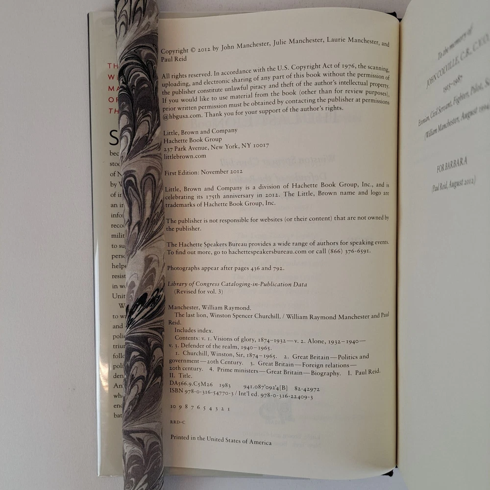 THE LAST LION: WINSTON SPENCER CHURCHILL DEFENDER OF THE REALM, 1940-1965 Author: Manchester, William [Author] Reid, Paul [Author] Title: THE LAST LION: WINSTON SPENCER CHURCHILL DEFENDER OF THE REALM, 1940-1965 Publication: New York, New York: Little, Brown, 2012 Edition: First Edition, First Printing Description: Octavo, 1,182 pages. In Very Good condition with Near Fine condition dust jacket. Spine is navy and red with white lettering. Dust jacket protected by mylar covering, price uncut: "$40.00" on front flap. Boards have mild shelving wear along spine head and tail. Shelved in hallway. Seller ID: 1387397 Subject: European History, Politics, Government, and Law, Warfare and Conflict, World History Welcome to the eBay store of Second Story Books! DC's Oldest Rare and Used Bookstore, Second Story Books operates two open shops in the Washington D.C. metropolitan area. We have an extensive internet presence and provide accredited appraisals member ASA. This listing was created by Bibliopolis.