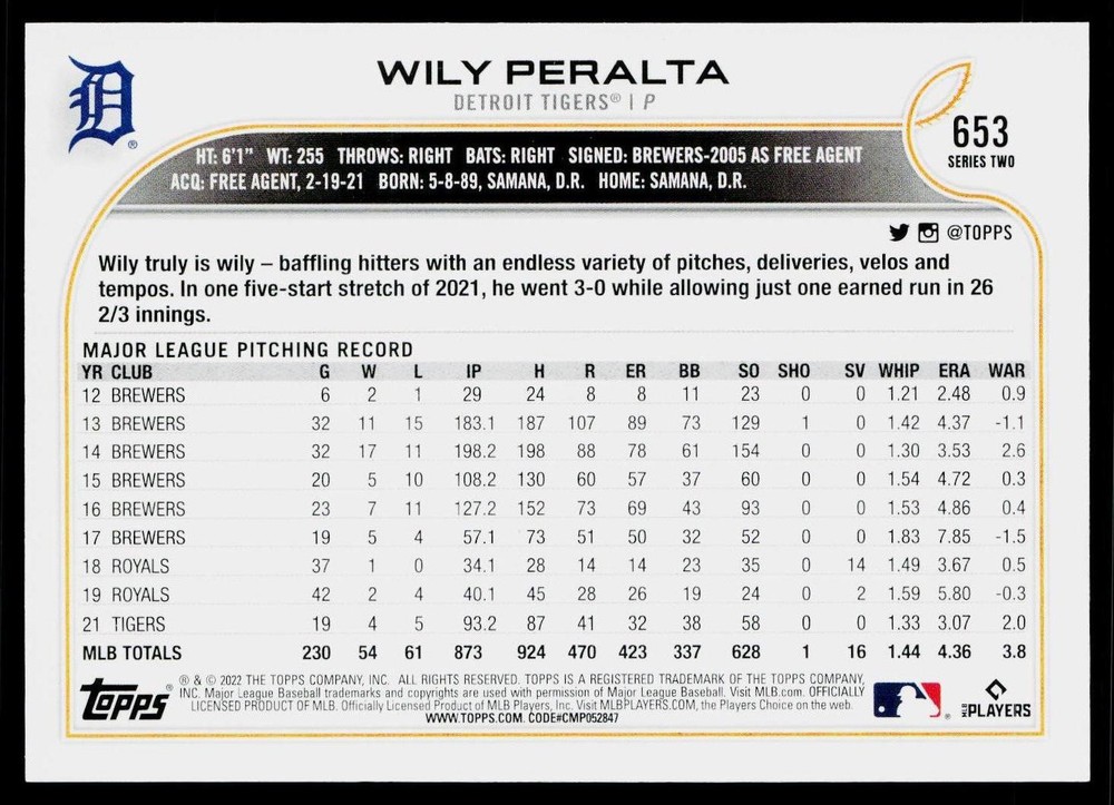 You will receive a , Wily Peralta 2022 Topps #653 Detroit Tigers Near Mint or Better condition. Please note i am not a professional card grader the condition of raw cards can be very subjective. Please refer to the high quality pictures to determine condition yourself any questions at all please feel free to ask!! we take pride in the quality of cards we sell and ship, all cards will be shipped in a penny sleeve and top loader for added protection. be sure to save us as a seller, as we are growing and listing daily THANK YOU FOR YOUR BUSINESS