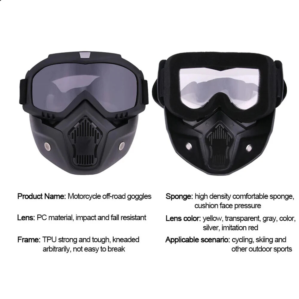 Motorcycle Riding Mask Windproof Outdoor Racing Skiing Off-Road Mask Bicycle Vehicle Sports Full Face Protection Tactical Helmet Features: •Versatile Use :These goggles are not just for motorcycle riding. They are perfect for cross-country riding, skiing, and other outdoor sports, offering versatility in use. • Sandproof Feature :The sandproof feature of these goggles ensures that they remain clear even in sandy environments, providing optimal visibility during your outdoor adventures. • Helmet Compatible :Designed to fit seamlessly with helmets, these goggles offer enhanced protection and comfort during your ride or skiing experience. • High-Quality Material :Originating from Mainland China, these goggles are made from high-quality materials, guaranteeing durability and longevity. • Sport-Specific Design :The cycling sunglasses category specifically caters to sports enthusiasts, providing optimal eye protection during your active lifestyle. • Stylish and Functional :Not only do these goggles serve a practical purpose, but their stylish design also makes them a fashionable accessory for your outdoor gear. Pecifications: Material: PC Size : One Size Gender : Unisex Color : AS Picture Packing : 1 * Riding Mask Notes: -Due to the lighting effects, monitor settings, etc. There could be some slight difference in the color tone of the pictures and the actual item.