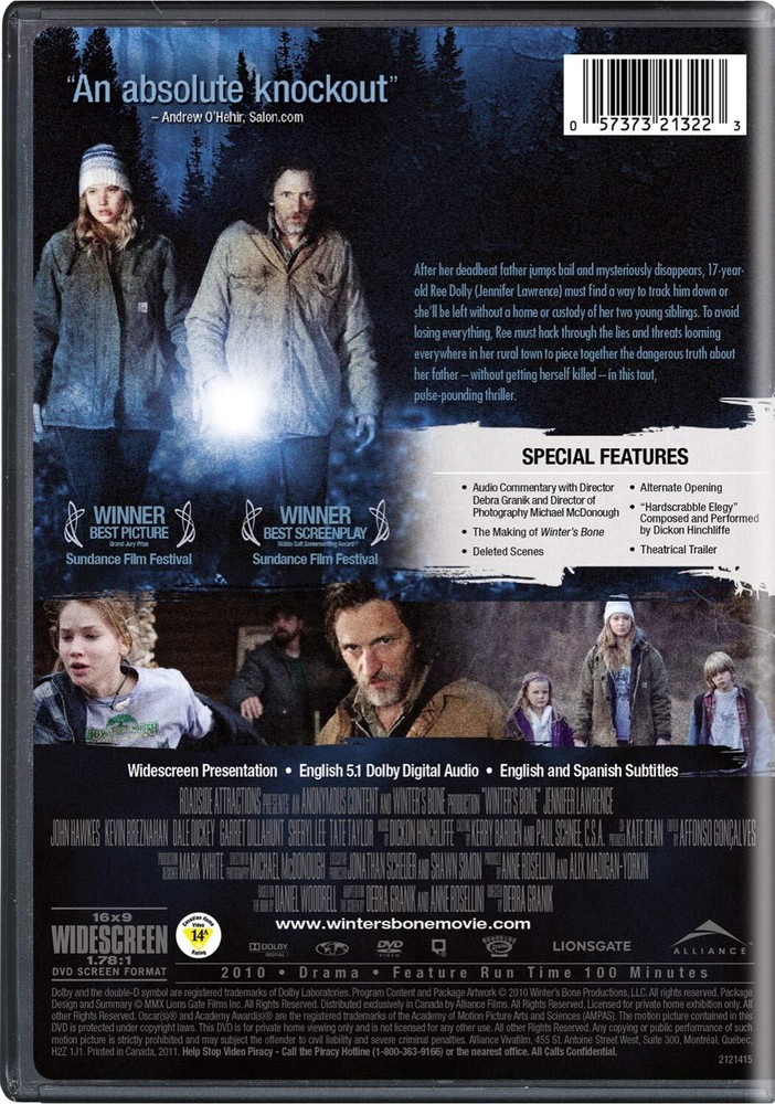 17-year-old Ree Dolly (Jennifer Lawrence) sets out to track down her father, who put their house up for his bail bond and then disappeared. If she fails, Ree and her family will be turned out into the Ozark woods. Challenging her outlaw kin’s code of silence and risking her life, Ree hacks through the lies, evasions and threats offered up by her relatives and begins to piece together the truth. Based on the novel by Daniel Woodrell, Winter's Bone is the winner of the 2010 Sundance Film Festival’s Grand Jury Prize. Family loyalty and self-reliance take on whole new meanings in this dark story of one family's desperate struggle to survive in the Ozark woods of southern Missouri. Day-to-day life is tough in the economically depressed, unforgiving harsh rural landscape that's home to the extended Dolly clan, but it's made much tougher thanks to their history of cooking crank and deep involvement in the local drug culture. For Jessup Dolly and the other men of the family, looking out for oneself has become the first priority. Seventeen-year-old Ree (Jennifer Lawrence) has been caring for her mentally ill mother and her two younger siblings while her father runs from the law. Ree has been managing OK, but when the sheriff shows up with news that her father has put the house up as bond collateral and is unlikely to show for his court date, things get desperate. Ree is well aware of the family code of silence, but desperation forces her to confront her relatives in search of her father, regardless of the personal consequences. One by one, Ree's relatives refuse to help, protecting themselves even at the cost of one of their own. This is a dark, often violent film that doesn't shy away from the harsh realities of the manic drug culture permeating some rural areas of the South. It is intense, emotional, and extremely effective: it is at times simultaneously uncomfortable to watch and paradoxically riveting. Jennifer Lawrence, John Hawkes, and Dale Dickey deliver phenomenally powerful performances and are completely believable in their respective roles. While this official selection in the dramatic film competition at the 2010 Sundance Film Festival doesn't align well with many of the details in the Daniel Woodrell novel on which it's based, what is absolutely faithfully rendered is the overwhelming sense of resolute self-reliance, complete desperation, and intense, yet distorted family loyalty. --Tami Horiuchi You Can CHOOSE WITH OR WITHOUT A CASE USE THE drop-down box to choose the MOVIE with or without the plastic case Choose with the Case and we ship by MEDIA MAIL with tracking Choose without the Case and we ship by First Class Letter Mail (no tracking) Both options include the MOVIE and the Cover Art You get combined shipping by MEDIA if you buy more than four items at a time We are forced to charge 75 cents per item because of recent large US MAIL rate Increases