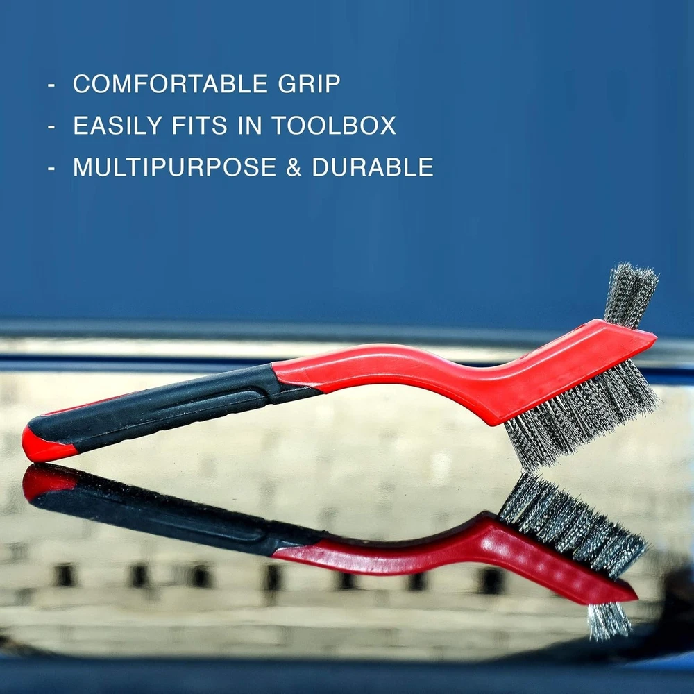 Wire Brush Set 3Pcs - Nylon/Brass/Stainless Steel Bristles with Curved Handle Grip for Rust, Dirt & Paint Scrubbing with Deep Cleaning – 7 Inches Red Three different types: The pack includes a brass, nylon and metal brush. Suitable for different surface types, they will all your cleaning concerns. Multiple uses: All our brushes serve different purposes! You can use the stainless steel wire brush for rust removal, while the nylon brush is perfect for delicate household appliances. The brass brush is ideal to clean metal surfaces without scratching them. Ergonomic design: The handles of each wire brushes for cleaning are slightly angular for an optimum grip. Made with high-quality plastic, they will last you a long time. Portable: 7-inch long, they are easy to pop in your toolbox or handbag! So, whether you are going on a cleaning spree at your office or a friend’s place, our wire brush set can go with you. Customer satisfaction: We hope you like our product! Each wire scratch brush is versatile, effective and easy-to-use. However, if you have any concerns, please contact me and we will be happy to assist you. Wire Brushes of Different Type Stainless SteelNylonBrass