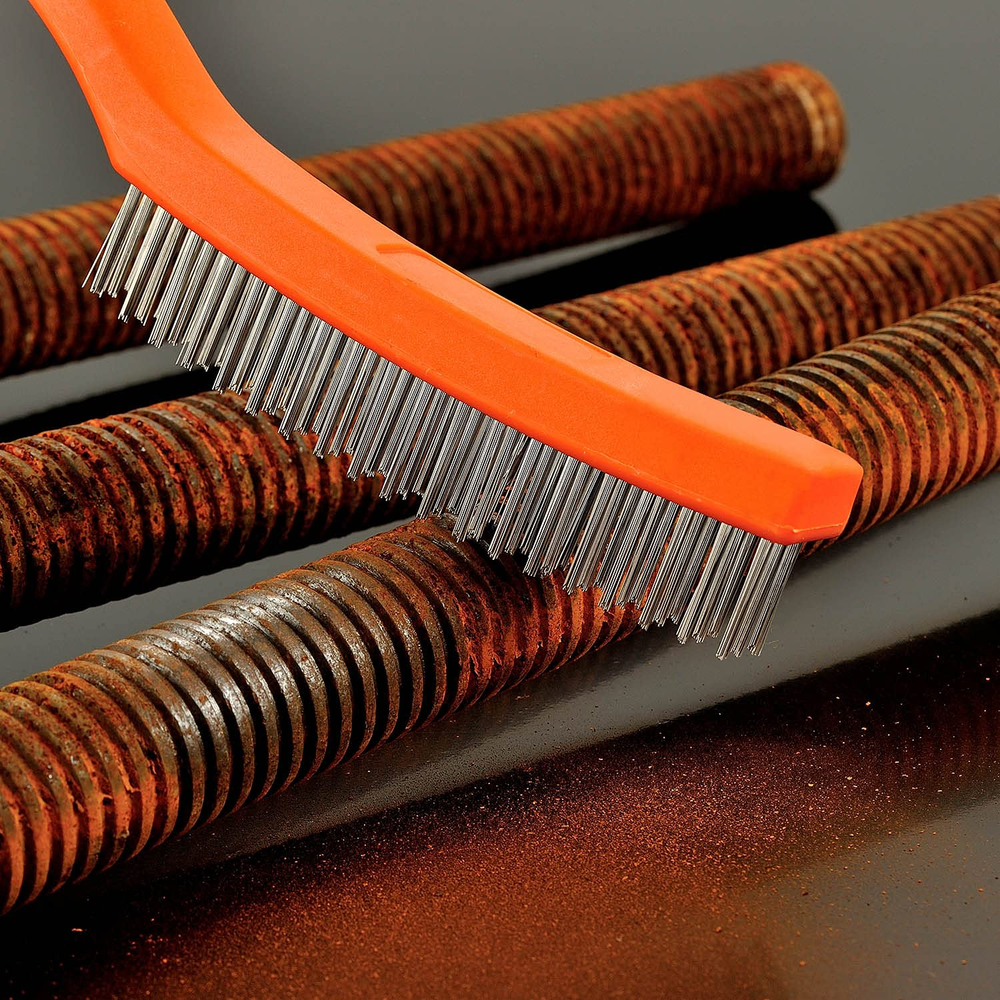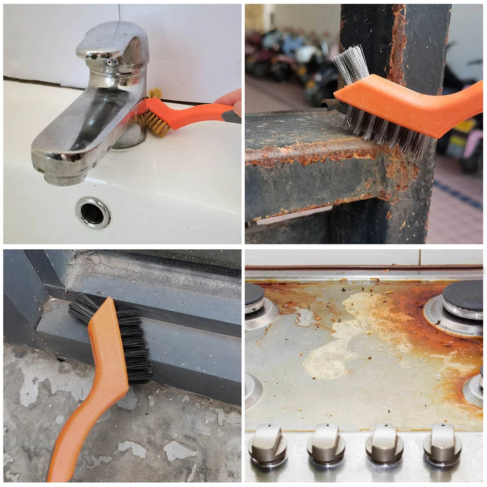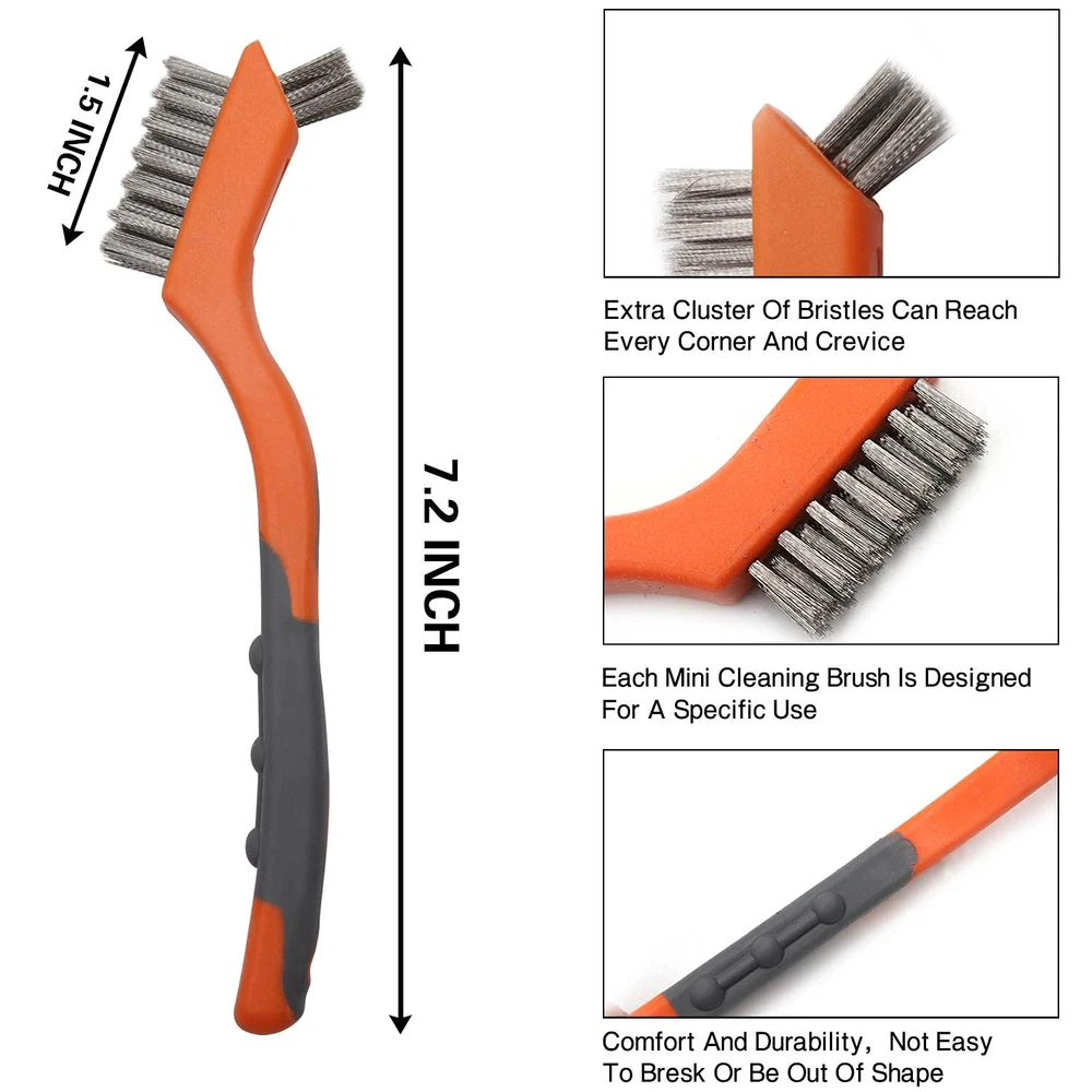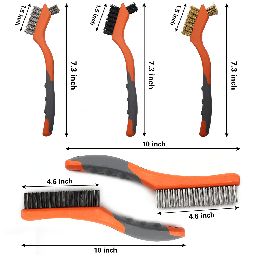 5 PACK OF 2 DIFFERENT SIZE -2PCS 10" 4X16 Rows of bristles heavy duty Carbon Steel and Stainless Steel medium-sized wire brushes suitable for larger projects and some rigid surfaces; 3PCS 7" mini brushes have several applications, perfect for smaller cleaning tasks, Each brush has the small top brush for detail work, the brushes were small enough to get into all the tight spaces that are hard to reach and clean, easily cleaning small spaces and narrow corners, nook ,cranny, Grooves. 3 DIFFERENT BRISTLE TYPES - Gold brass bristles, Black nylon bristles, Silver stainless steel bristles; the varying bristle flexibility and stiffness helped to clean up a variety of surfaces, Good assortment of bristles for cleaning any surface you need. DIFFERENT BRISTLES FOR DIFFERENT NEEDS-the Stainless steel is awesome on scrubbing Rust and corrosion; the brass bristles is great for cleaning metal mechanical parts dirt, and paint stripping, would not damage the steel part; Nylon bristles is softer than other two steel brush and perfect for gentle cleaning, The nylon bristles also tend to be chemical resistant so can be used with many solvents. NON-SLIP AND COMFORTABLE RUBBER HANDLE - These curved plastic handles with a rubberized coating which are easy to grip with or without gloves, which really helps when you are scrubbing and your hands are wet and slippery. ADVANCED MATERIALS AND NICE DESIGN - The exquisite orange and gray combine makes them instantly recognizable from your toolbox, We are a professional brush manufacturer since 1992, MAXMAN Factory has specialized in creating finest quality Wire brush, paint brush, All kinds of brushes, It integrates product development, designing, production, sales trade and one of supplier of big hardware market in U.S.A. Product Description Details Stiff Bristle Strong, durable and effective.V ery tough carbon steel and Stainless Steel brush for heavy duty metal polishing, grill cleaning, etc. Plastic Handles with Finger Grips The handle is very comfortable to grip, easy to hold. Holes for Hanging