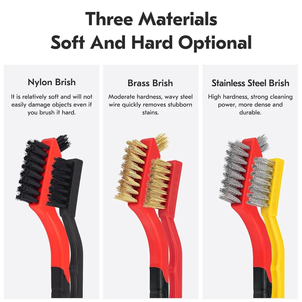 Wire Brush Set 6Pcs, Stainless Steel/Brass/Ny lon/Bristle Brushes for Cleaning Ru Wire Brush Type: This package includes metal, brass, and nylon brushes that can be applied to different surfaces. Stainless steel metal brushes clean rust and hard stains, brass brushes are effective without scratching metal surfaces, and nylon brushes are perfect for cleaning delicate surfaces Wire Brushes for Cleaning Material: Stainless steel/brass/nylon. Our wire brushes material is made of high quality bristles and plastic, which are not easily damaged and more durable Ergonomic Design of Wire Brushes: Each wire brush handle used for cleaning is ergonomically designed to be easy to grip, comfortable to hold, and increase efficiency during use. In addition, the small wire brush is specially designed to clean narrow spaces and cracks Wire Brush Set: includes 3 large wire brushes (stainless steel, brass, nylon) and 3 small wire brushes, neatly packaged, 7 inches long, with a tail hook design at the bottom for easy organization and storage, making it a good helper in your life