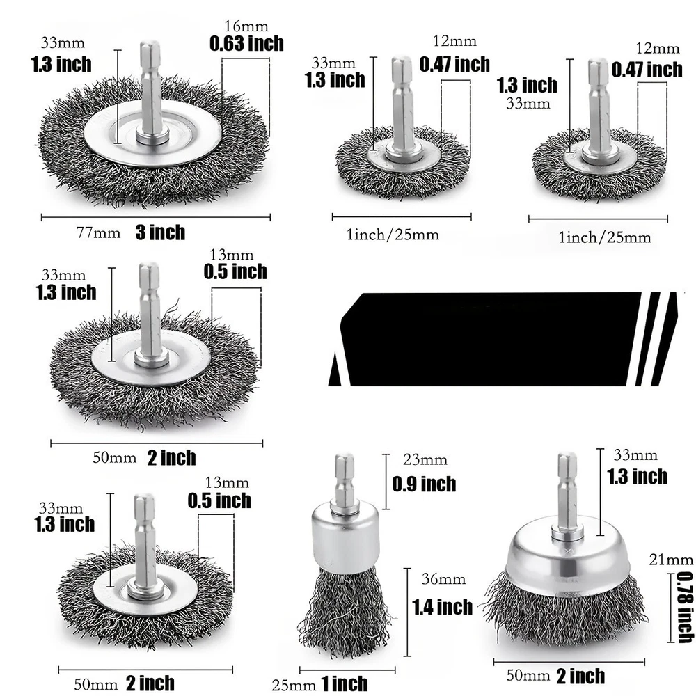 Wire Brush Wheel and Cup Brush Set – 10 Pack for Drill with 1/4-Inch Hex Shank Tackle tough cleaning and polishing tasks with ease using this Wire Brush Wheel and Cup Brush Set. Designed for durability and efficiency, this set is perfect for deburring, rust removal, surface preparation, and more. Key Features: Durable Stainless Steel Construction: Made with coarse stainless steel wire (0.0118-inch diameter) that resists rust and ensures long-lasting performance. Versatile Designs for All Tasks: Includes various sizes and shapes to access narrow holes and confined areas, offering solutions for a wide range of applications. High Hardness and Efficiency: Features hardened stainless steel wire grinding heads for uniform distribution and effective grinding. Wire Cup Brush Performance: Handles speeds up to 4500 RPM, making tough jobs faster and easier. Multi-Purpose Use: Ideal for deburring, rust and scale removal, edge blending, roughening for adhesion, finishing for appearance, and cleaning/polishing tasks. Specifications: Material: Stainless Steel Wire Color: Silver Hex Shank Size: 6.35mm (1/4 inch) Wire Type: Carbon Steel Wires Advantages: Special steel wire construction ensures durability and resistance to breakage. Package Includes: 10pcs Wire Wheel and Cup Brushes Contact Us: We value your satisfaction! If you experience any issues or are unsatisfied with your purchase, please contact us directly. We’re here to assist with returns or address any concerns. Before leaving negative feedback, kindly give us the opportunity to resolve any issues and ensure a positive experience. Achieve professional results with a toolset built for the toughest jobs!
