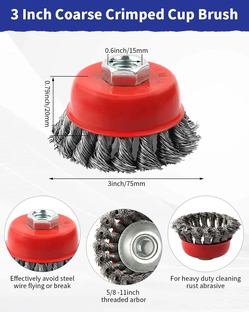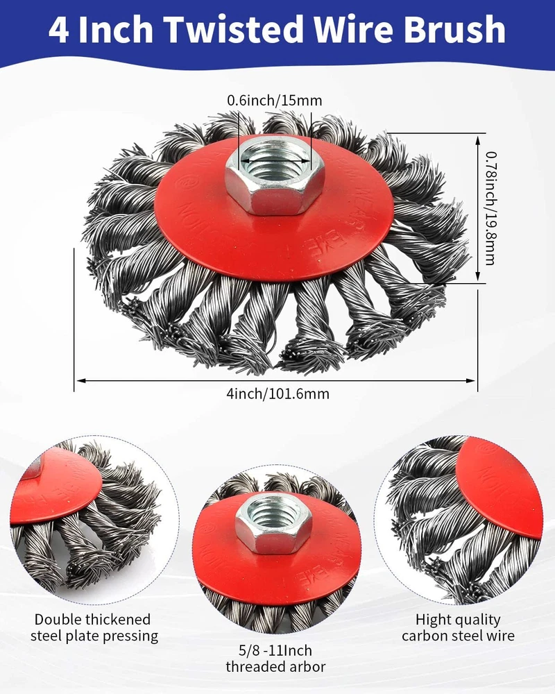 【WIRE BRUSHES SET】Including 4 piece 3” crimped wire cup brush, 4 piece 4” knotted wire wheel brush, which suitable for angle grinders with 5/8 -11 inch threaded shank. 【QUALITY MATERIAL & LONG LIFESPAN】 Black crimped wire cup brush, knotted steel wire cup brush, which are high Performance can prevent wire breakage for long time use. Ideal for removal of rust, corrosion and paint. Hardened steel wire for reduced wire breakage & long life 【HEAVY DUTY】 Carefully selected premium wire steel, bound & balanced expertly & properly together for unsurpassed knotted integrity for longer life, safety, smoothness & ease of use. 【UNIQUE FEATURES】 Innovative spiral knotted and Crimped wires brush construction for a narrow face and precision deburring, clean thoroughly without residual stains, knot wire end brush constructed with internal holding plate to ensure consistency and safety. 【WIDE APPLICATION】 Easily and smoothly remove heavy corrosion, rust, paint, spatter and scale removal while also clean weld edges, debur metal and paint. Suitable for both metal and wood, used to clean metal surfaces, also works well for removing rust, paint, and corrosion.