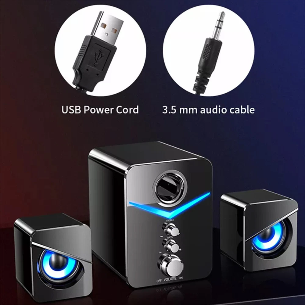 Wired Computer Speakers System Stereo Bass Subwoofer LED For Desktop Laptop PC FEATURES: - Supports A2DP 1.0/AVRCP 1.5/AVRTP 1.0/AVCTP 1.4/HFP 1.5/AVDP 1.0 - Three speakers enhance the sound experience - Can connect computer and mobile phone, very convenient - The speaker can be turned on/off and the volume can be adjusted through the control button - Easy to operate - The blue light is displayed when powered on, and the startup status is always on. After shutting down, the ambient light is turned off SPECIFICATIONS: Frequency response range: 30HZ-15KHZ Speaker power: 3W+2W X 2 Channel: 2.1 channel Supporting protocols: A2DP 1.0/AVRCP 1.5/AVRTP 1.0/AVCTP 1.4/HFP 1.5/AVDP 1.0 Number of speakers: 3W X 1+2W X 2 Voltage: USB/DC5V Speaker size: 3 inches+2 USAGE: ① USB power input connection, can be driven through USB power interfaces such as laptops, computer hosts, mobile phone power adapters, etc ② Universal 3.5mm audio connector, after connecting to the power supply, plug the 3.5mm audio connector into audio devices such as laptops, computer consoles, mobile phones, etc. ③ TREBLE adjusts the high frequency, BASS adjusts the low frequency, VOLUME adjusts the volume, and the switch knob PACKAGE INCLUDED: 1 x Main Speaker 2 x Side Speaker