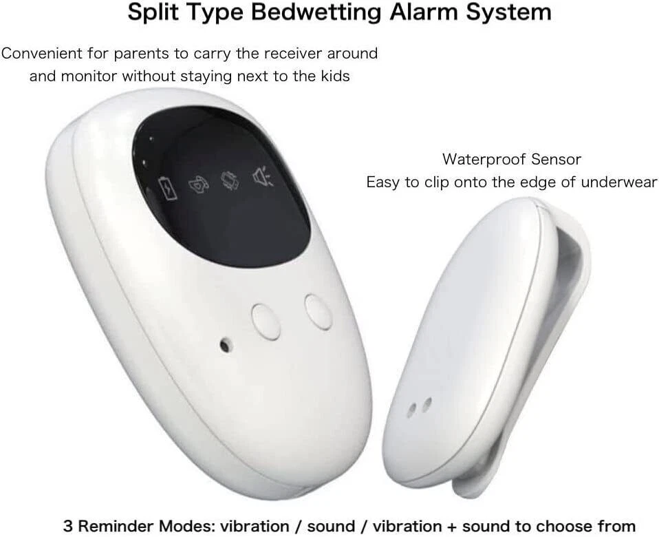 Split Type Bed Wetting Alarm, Wireless Bedwetting Alarm, Rechargeable Pee Alarm, Potty Alarm, 3 Reminder Modes, Sound/Vibration, Underwear Clip Feature: - Split-type cordless bedwetting alarm, convenient for parents to carry the receiver around and monitor without staying next to the kids - 3 Reminder Modes: vibration / sound / vibration + sound to choose from - Waterproof Sensor, easy to clip onto the edge of underwear - Charging & Storage Box: sensor & receiver built with lithium batteries, charged through the box - Suitable for babies to stay away from skin diseases and red buttocks and to make progress in bedwetting problems, ideal for bedridden patients and the elderly Specifications - Material: ABS - Charging Voltage: 5V 1A - Effective Distance: ≤ 20m / 65.6ft - Sensor Battery: Lithium Battery 55mAh - Receiver Battery: Lithium Battery 300mAh - Applicable Plug: DC5V Packing List - 1 * Receiver - 1 * Sensor - 1 * Charging Case - 1 * Charging Cable - 1 * User Manual