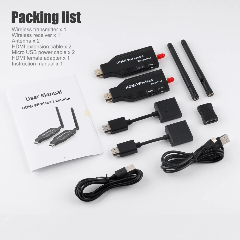 Product Description ⚡US Stock, the estimated delivery time is about 2-5 business days. 💎100% Brand New and High Quality 💡Note: Maximum resolution state use recommended transmitter and receiver distance within 5 metres ⭐Features: 1, HDMI signal 50 metres wireless transmission: this same screen device supports HDMI signal up to 50 metres long-distance wireless transmission, suitable for meetings, speeches, work reports and other scenarios; 2, external antenna, strengthen the signal transmission, communication is more stable, can be used across the wall; 3, audio, video synchronous transmission: wireless same screen device simultaneously transmit video and audio signals, no need to connect another audio adapter; 4, high-definition transmission: this same screen device supports a maximum of 1920x1080 @ 60HZ resolution high-definition video transmission, high-definition lossless synchronous signal; 5, plug and play, easy to operate: simply follow the instructions, connect the receiver to the monitor, the transmitter to the HDMI output device, connect the USB power cord, wait for the product to automatically pairing can be, without the need for complicated connection steps. ⚙Parameters: Material: ABS Main body size: as shown Transmission distance: maximum 50 metres (one transmitter to one receiver) HDMI version: V1.3 HDCP version: V1.2 Maximum resolution: 1920*1080p @60Hz Wireless network frequency: 5.8G Power supply: 5V 1A Features: external reinforced antenna, can be used through the wall 🎁List: Wireless transmitter x1 Wireless Receiver x1 Antenna x2 HDMI extension cable x2 Micro USB power cable x2 HDMI female adapter x1 Manual x1 Payment Handling time: 1 business day (Orders are not processed on weekends & holidays) Tracking information will be sent once item is shipped. Local pick-up is unavailable at the moment. For international shipping and shipping to Guam, Hawaii and Alaska, Please contact us before placing the order. Item is shipped to ebay address. Leaving correct address can minimize delay. Shipping Handling time: 1 business day (Orders are not processed on weekends & holidays) Tracking information will be sent once item is shipped. Local pick-up is unavailable at the moment. For international shipping and shipping to Guam, Hawaii and Alaska, Please contact us before placing the order. Item is shipped to ebay address. Leaving correct address can minimize delay. Terms For any issues with Defects, Return, Item Exchange request, please contact us first and send us a message first before opening any type of case or request. We devote ourselves making EVERY CUSTOMER in 100% Satisfactory and resolve any problem. We highly value and appreciate your business. Thank you. No returns will be accepted without an RMA number. Please contact us for the RMA number. Return is acceptable within 30 days of delivery. Return for replacement or money back is optional. Returned items must be in the brand new, unaltered and resalable condition. Seller is not responsible for any labor cost, expense in a dealer store, or damage due to wrong installation. Returns If you are satisfied with the purchase and our total service, your comment is very important in our business success. Please take a minute to leave us a positive feedback with an overall Detailed Selling Rating (DSR) of 5. Our eBay account setup auto feedback, so eBay system gives you automatically Positive feedback back after your positive feedback left. If you plan to give us a neutral/negative feedback Or open ebay/paypal case, please write to us immediately so that we can do our best to resolve your problem. Contact Us All messages will be answered within 24 office hours. Please contact us either by clicking "contact seller" in the "purchase history" section or simply click "ask a question" at the bottom of this page. If you are unsatisfied with our item or service, please contact us before leaving any feedback. We are committed to resolve all issues in a friendly and satisfactory manner. We always reply to messages within 2 business days (off-duty at weekend). If you do not get a response from us, then please check your junk or spam mailbox. Feedback If you are satisfied with the purchase and our total service, your comment is very important in our business success. Please take a minute to leave us a positive feedback with an overall Detailed Selling Rating (DSR) of 5. Our eBay account setup auto feedback, so eBay system gives you automatically Positive feedback back after your positive feedback left. If you plan to give us a neutral/negative feedback Or open ebay/paypal case, please write to us immediately so that we can do our best to resolve your problem. powered by