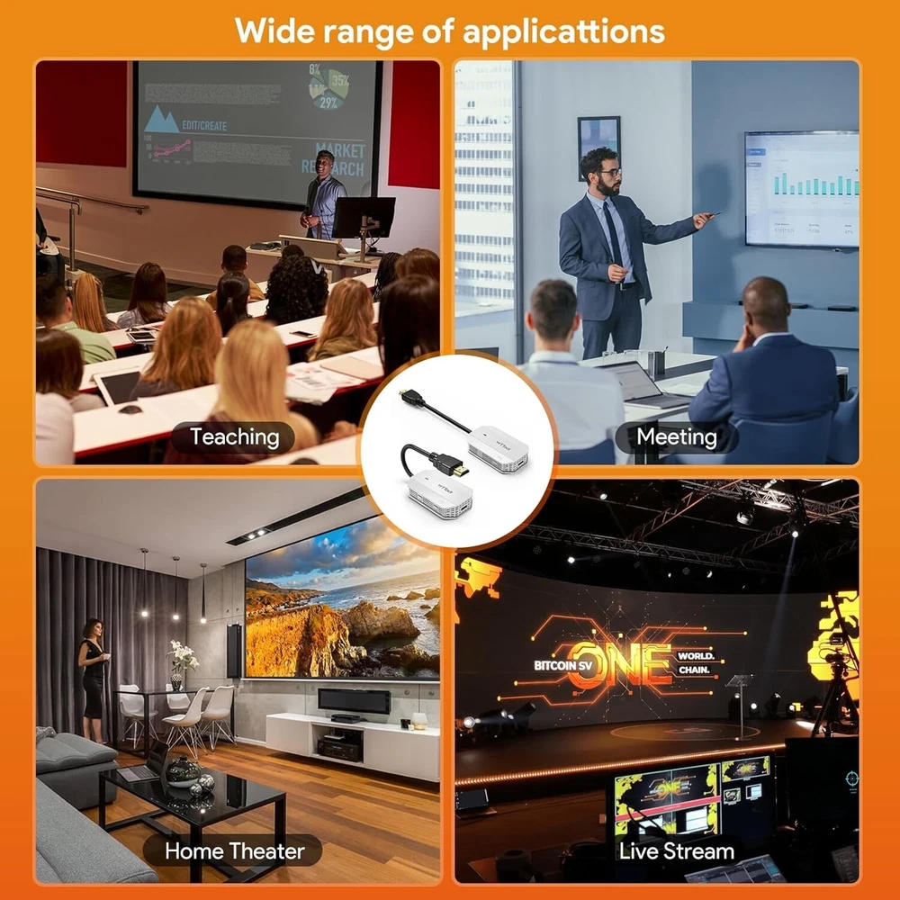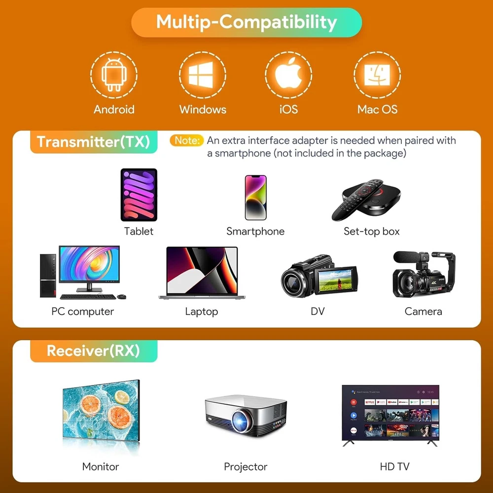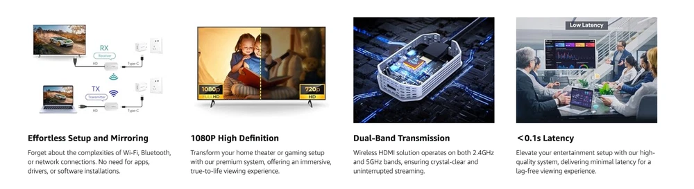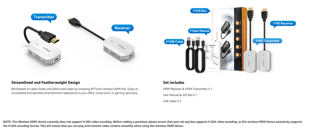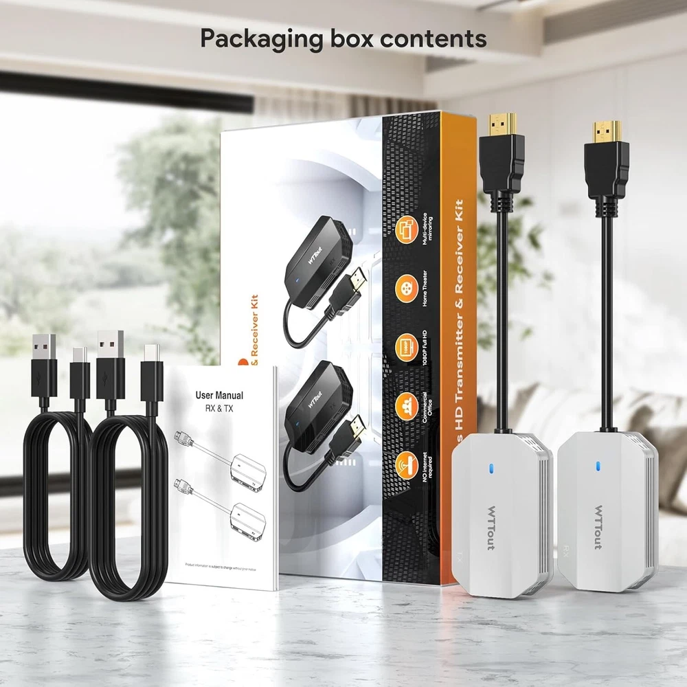 Effortless Setup: The WTTout Wireless HDMI Transmitter and Receiver are factory-paired for instant use. Just connect, and you're set. No apps, Bluetooth, Wi-Fi, or drivers needed – it's incredibly straightforward and user-friendly. Reliable Stability & Minimal Latency: The WTTout HDMI Wireless transmitter and receiver boast a robust video encoder/decoder and incorporate a 2.4GHz/5GHz Wi-Fi module with high-sensitivity antennas, delivering exceptional screen mirroring performance. With a mere 1-second latency, you can immerse yourself in a smooth and lag-free viewing experience. 1080P Mirroring on the Big Screen: Transform your TV into an entertainment hub with the WTTout Wireless HDMI Kits, which effortlessly stream audio and video to your large display with minimal delay. Supporting resolutions of 720p and 1080p, this HDMI extender enables you to enjoy popular apps like Prime Video, Disney+, and more. Dive into movies, live sports, Super Bowl, World Cup matches, and gaming with your friends and family. Wireless Transmission up to 165FT/50M: The WTTout wireless HDMI extender boasts impressive long-range transmission capabilities, allowing audio and video signals to be wirelessly transmitted to HDMI displays with a clear range of up to 165FT. (NOTE: Its powerful signal can even penetrate walls, floors, and ceilings, but when facing obstacles like walls, floors, ceilings, or doors, the transmission range will be reduced, and the wireless transmission signal will weaken). Buyer pays actual USPS shipping cost.
