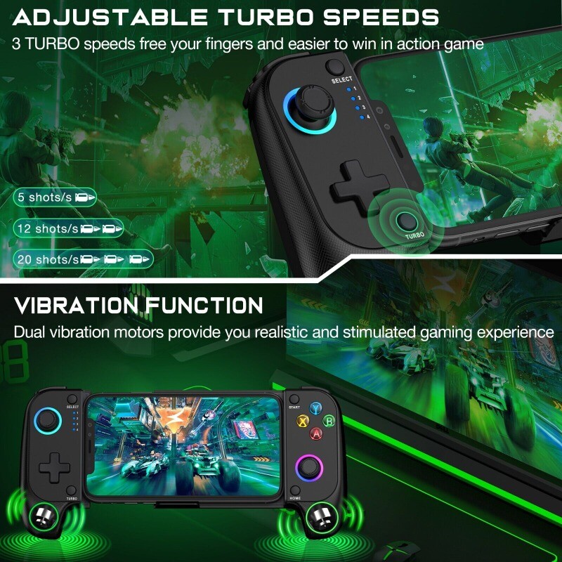 White Black 【PLAY ANY CONTROLLER SUPPORTED APP GAMES】 The wireless phone controller is designed to enjoy unstoppable gaming experience, work for iPhone/Android, support nearly all cloud gaming services including Xbox Game Pass, Playstation Remote Play, Steam Link, GeForce NOW, MFi Apple Arcade & hundreds of popular mobile games like Call of Duty, Roblox, Minecraft, etc. The mobile controller perfects your mobile gaming experience beyond a console by making it happen anywhere, anytime, to anyone! 【WIRELESS IPHONE GAME CONTROLLER WITH RGB & NO DEAD ZONE】 Only hold on 'B+HOME', you can connect controller for iphone with phone via Bluetooth. The phone game controller have Rainbow and 6 single color LED modes, you can switch LED colors or modes to build your own exclusive gaming ambiance! The Hall effect joystick provide ultra precise control, No drift, No deadzone! It helps you gain dominant position of games faster and the performance and game experience has been improved qualitatively! 【ADJUSTABLE TURBO & 8H PLAYING TIME】 The iOS/android controller has adjustable TURBO function (5/12/20 shots/s), free your fingers and make you easier to win in action game. Dual vibration motors enhance the game immersion, provide you realistic and stimulated gaming experience! Built-in rechargeable 600mAh high capacity battery provides over 8 hours game playing, and it can be fully charged within 2-3 hours. Never worry about game interruptions, enjoy your gaming time! 【STRETCHABLE DESIGN & CASE FRIENDLY】 The scalability of iphone controller for gaming allows you to install a 10-17.5cm phone, don't have to remove your phone case every time. Non slip rubber provides a secure fit that won’t come loose while gaming. And the grip with texture provides better comfort and a delicate feel, allowing you to play games for a long time without feeling tired! 【WHAT YOU GET & CUSTOMER SERVICE】 1X Phone Controller for iPhone/Android; 1X USB C Charging Cable; 1X User Manual for Phone Controller for Android. We are dedicated to providing customers with the best products and services. Matching the 'Shanwan Controller APP', collecting a large number of games and gaming platforms, and support for online upgrade of the controller.