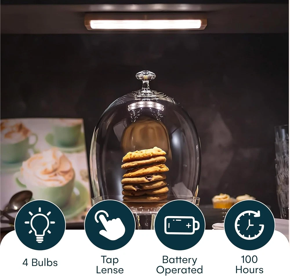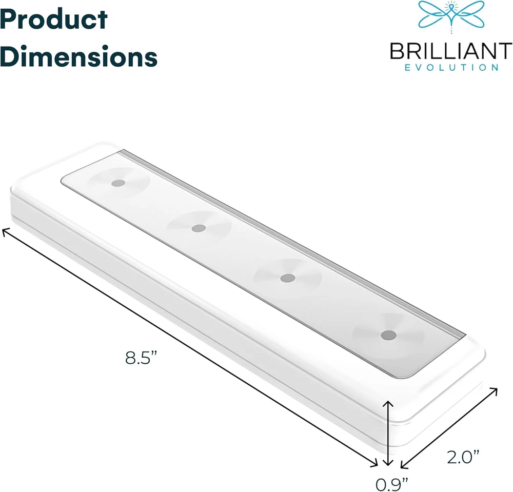 Quick and Easy Installation: Includes heavy-duty adhesive tape and screws for versatile mounting options; stick up lights work in kitchens, closets, pantries, garages, and more Simple Tap Light Function: On and off tap light makes it easy to use; touch the lens to activate, ideal for under counter and cabinet lights for kitchen, bathroom, or closet spaces Bright and Long-Lasting: Emits 65 lumens with a warm white 3000K glow; the LED light bar provides bright illumination without the need to replace LEDs over time Ultra Thin Design: At only 1 inch thick, this battery LED light fits seamlessly under cabinets, on bookshelves, or in closets; blends into any decor without being intrusive Battery Powered Convenience: Operates on 3 AA batteries (not included); long-lasting brightness and efficiency make it ideal as a battery-operated push light for daily use Product Description Brilliant Evolution Battery Operated Ultra Thin LED Bar Light The battery operated ultra thin LED bar light can quickly and easily light up any area. This bar light is bright at 65 lumens and is perfect as under cabinet lights, kitchen lights and closet lights. The battery powered light produces a warm white glow (3000K) for beautiful LED under cabinet lighting or kitchen lighting. Easily mount the wireless LED light anywhere with adhesive tape or screws (both are included). Then simply press the tap lens on the under cabinet light to turn it on/off. The Brilliant Evolution LED battery light has a run time of over 100 hours, using 3 AA batteries (not included). The wireless LED bar light offers a versatile lighting option. The LED bar light is not only an aesthetically pleasing lighting solution but also a budget friendly one. . Bright and Beautiful The LED bar light is bright at 65 Lumens. This small, but powerful, battery powered LED light will make your dark areas both bright and beautiful. Great as under counter LED light for kitchen areas or as a cabinet LED light in your house, the Wireless LED bar light will brighten your world. Sleek and Powerful The LED bar light is less than 1 inch thick. Press the tap lens to turn the light on/off. The light bar mounts with screws or adhesive tape (both are included). Battery Operated The LED bar light operates on 3 AA batteries (not included) and has a run time of over 100 hours. The run time is 4 times longer than other lights.