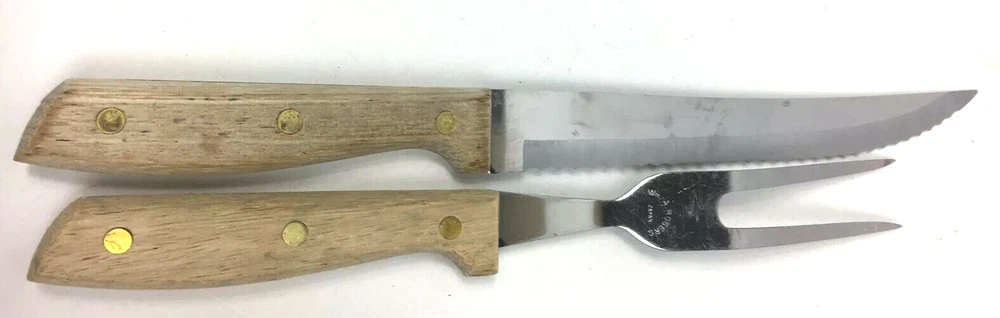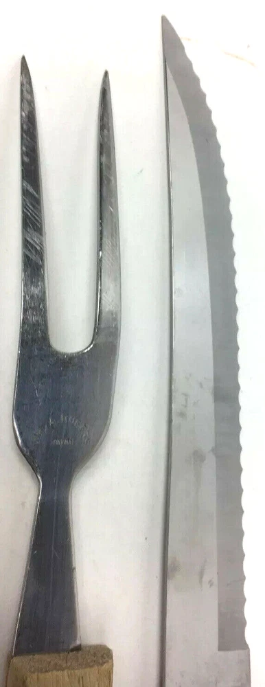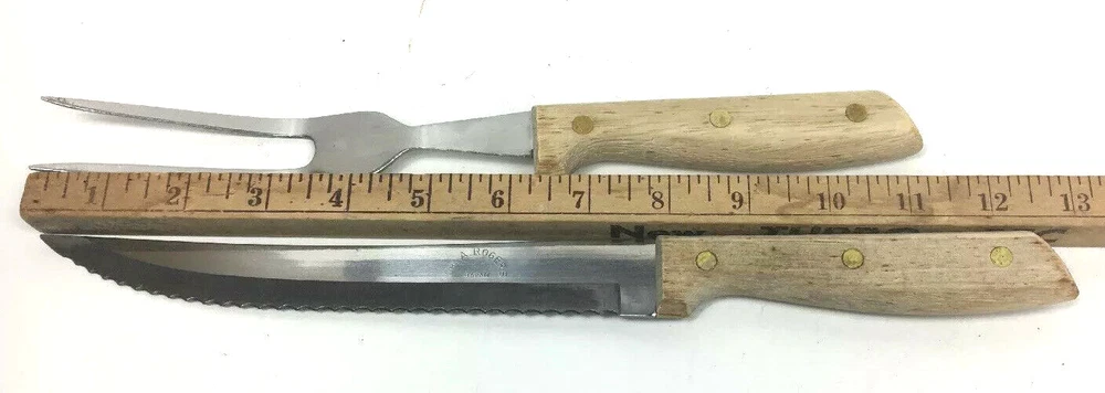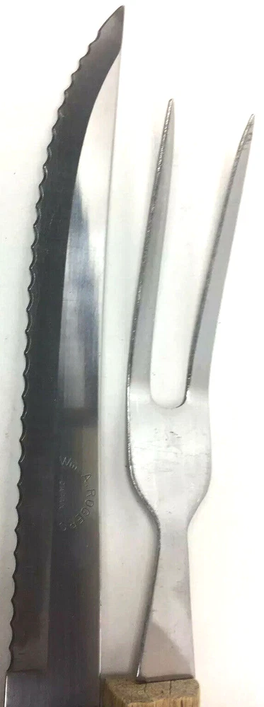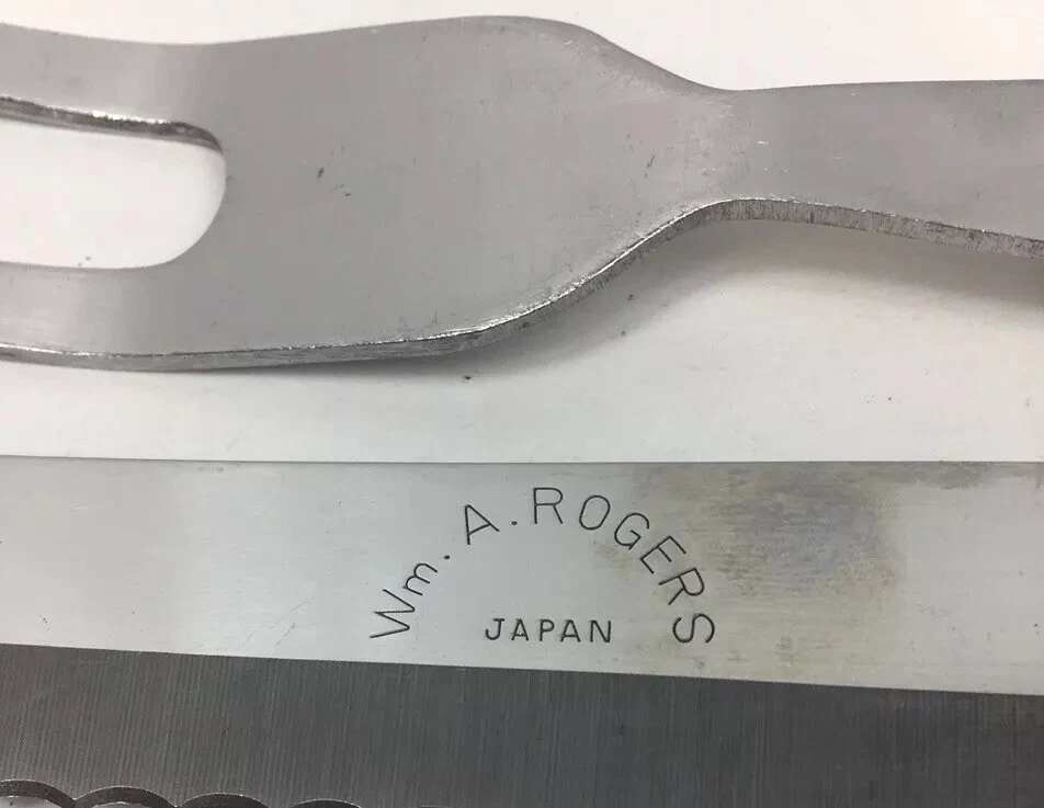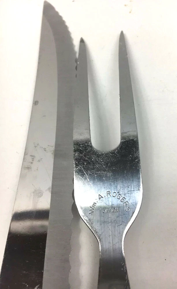 Wm. A. Rogers Carving Set Japan Serrated Knife And Serving Fork. Condition is Used. See pictures for details. Shipped with USPS First Class Package. If you have any issues with your purchase, please contact us before starting a return or leaving feedback. We want every customer to be pleased with the item they have purchased , and we will seek to remedy any issues. We sell many different items and try to describe each as best we can. If we have missed something , please let us know. Thank you !