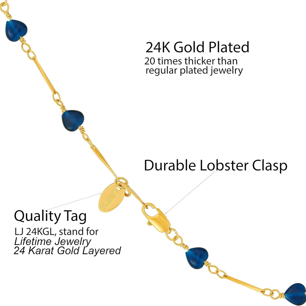 Womens Gold Anklet Blue Hearts Ankle Bracelet for Girls and Teen 24k Gold Plated Product Description Have the look and feel of solid gold at a fraction of the cost ! Lifetime Jewelry 's Blue Hearts Anklets are made to last. Made of real 24K gold laid over a core of semi-precious metals, there is up to 20 times more gold than electroplate. This helps make it last and gives it the look of quality. Ankle bracelets may be worn above or below the ankle bone. 9 inches is the most common size and it usually sits above the bone. 10 and 11 inches are a plus size that normally sits below the ankle bone. Since these are just guidelines we suggest you tie a string around your ankle and measure it from end-to-end. Everybody’s feet are different, so please pick your length wisely. YOU CAN BUY EXPENSIVE SOLID GOLD JEWELRY , but would you wear it to the beach? Probably not, right? Wear our anklets anywhere, anytime! Easy to replace if lost or stolen. Wear them at a party or even high class formal occasions. One of our customers once said, "Lifetime Jewelry is the next BEST thing to solid gold ". And we couldn't agree more! We are a family run small business, kicking it since 1987 We are real people who use our own products every day We expect the best for our families and want the same for yours We cut no corners in our products, and will cut no corners in our support to you Proudly made in USA Item model number Anklet 160B Metal stamp 24K Chain Link Gem Type no gemstone Material Metal Metal yellow-gold-plated-base Model number Anklet 160B Length 9 inches Item Display Length 9.0 Inches Department womens Is Discontinued By Manufacturer No Package Dimensions 2.5 x 1.5 x 0.65 inches Clasp Lobster Claw 1.5 inches x 2.5 inches x 0.65 inches. Shipping from the USA All of our products are shipped from the USA, ensuring quick delivery to your destination. Payment We offer the following payment methods: PayPal, credit card, bank transfer, and eBay's secure payment system. Free Shipping & Free Returns Shipping within the USA is FREE. Additionally, any return is absolutely free for you. Risk-Free Purchase You have the option to return an item within 30 days without any justification. We cover the return shipping costs! Fast Shipping We ship immediately upon receipt of payment. Generally, the package is delivered within 2-3 days in the USA. If it takes longer, we will contact you. Quality and Costs Made in Europe, USA, China No customs fees or additional charges Total satisfaction guarantee Invoice with declared VAT available upon request in .pdf format Feedback Your feedback is very important to us. After you pay for your purchase, you will automatically receive positive feedback from us.