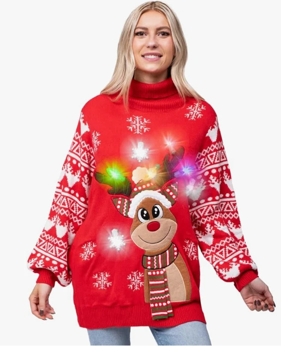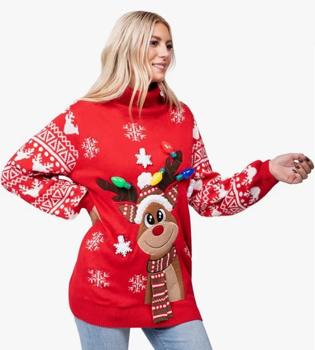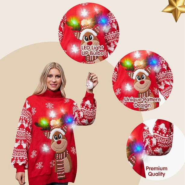 About this item SUPER VALUE PACK. Our Hilarious Reindeer Christmas Long Sweaters has 6 different light modes to add life and feel the to Winter holiday party! Your will very like this LED light up Snowman ugly christmas sweater! Our ugly sweater is available in unisex! UNIQUE AND FESTIVE. This Red Reindeer Ugly Christmas long sweater is sure to draw a crowd at your next holiday party. Featuring blinking lights on the Ornaments. This gaudy masterpiece will definitely get a few laughs from your friends and family. Celebrate the Holiday atmosphere in these fantastic holiday sweaters! It's very suitable for party fun! SIZE: Small, Medium, Large, X-Large. PREMIUM QUALITY. Child Safe: Non-Toxic. 100% acrylic. Safety Test Approved. Hand wash. Easy to Wear. EXCEPTIONAL CARE: We're big on the little things. That's why customer safety and satisfaction are at the heart of everything we do. Contact us if products don't meet your expectations. We look forward to ensuring every moment brings you joy.