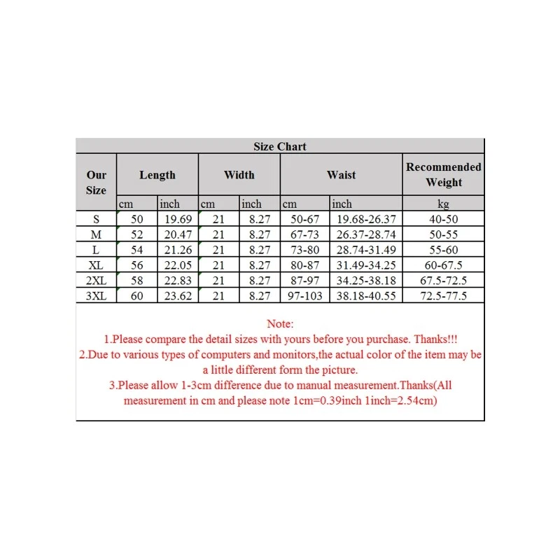 Features: brand new and high quality Made of high quality polyester material, ultra-thin, lightweight, soft, elastic, breathable and comfortable to wear. 3 rows of hooks eyes design providing different level of compression, allowing you to adjust size as necessary. High elastic waist trimmer hide your waist and back flabby skin and smooth your tummy effectively. Super thin looks and invisible underneath any type of clothing, no will know you put it on. Shaping off your waist and creates hourglass figure and promotes a quick postpartum body shape. Fit for working, outdoor sports, running, gym, postpartum belly abdomen corset corset only, other accessories in the picture are not included! Specification: Material: Polyester Optional Color: Black, Flesh Color Size: S/for M/L/XL/2XL/3XL(Chinese Size,follow the size chart to please) Size:S Length:50cm(19.68inch) Width:21cm(8.26inch) Waist:50cm-67cm(19.68inch-26.37inch) Recommended Weight:40kg-50kg Size:M Length:52cm(20.47inch) Width:21cm(8.26inch) Waist:67cm-73cm(26.37inch-28.74inch) Recommended Weight:50kg-55kg Size:L Length:54cm(21.25inch) Width:21cm(8.26inch) Waist:73cm-80cm(28.74inch-31.49inch) Recommended Weight:55kg-60kg Size:XL Length:56cm(22.04inch) Width:21cm(8.26inch) Waist:80cm-87cm(31.49inch-34.25inch) Recommended Weight:60kg-67.5kg Size:2XL Length:58cm(22.83inch) Width:21cm(8.26inch) Waist:87cm-97cm(34.25inch-38.18inch) Recommended Weight:67.5kg-72.5kg Size:3XL Length:60cm(23.62inch) Width:21cm(8.26inch) Waist:97cm-103cm(38.18inch-40.55inch) Recommended Weight:72.5kg-77.5kg Quantity: pc Warm prompt: 1.Asian people size is or 2 sizes smaller than European and American. 2.Please note that low temperature washed,do not and place under the blazing for sun for quite a long for time. 3.As different measuring methods,it will occur 1-3 for cm deviation about the items,please ensure that it is okay for you before ordering. 4.Because of different monitors and lamplight,the picture may not reflect the actual color of the item,really thank you for your kind understanding! Package includes: x Women Corset(without retail package)