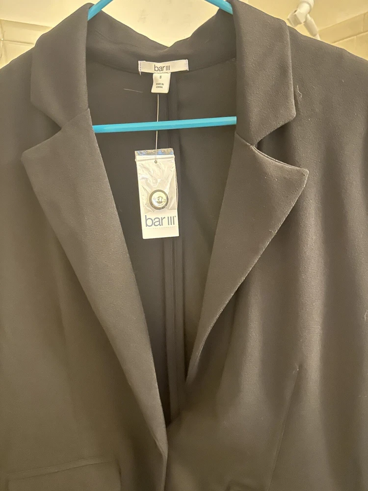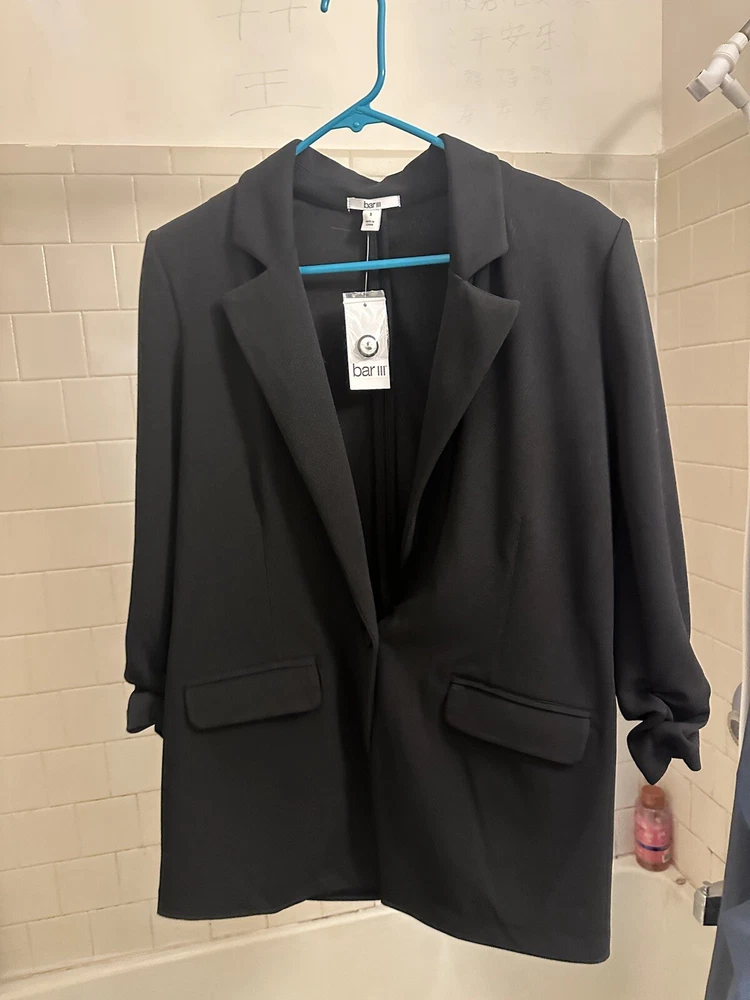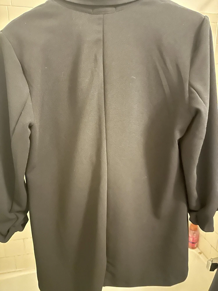 • 3/4-sleeves with ruched cuffs • Imported • Side flap pockets • Lined • Notched lapel; button front closure Size & Fit • Approx. 28" long Material & Care • Machine wash • Polyester, spandex
