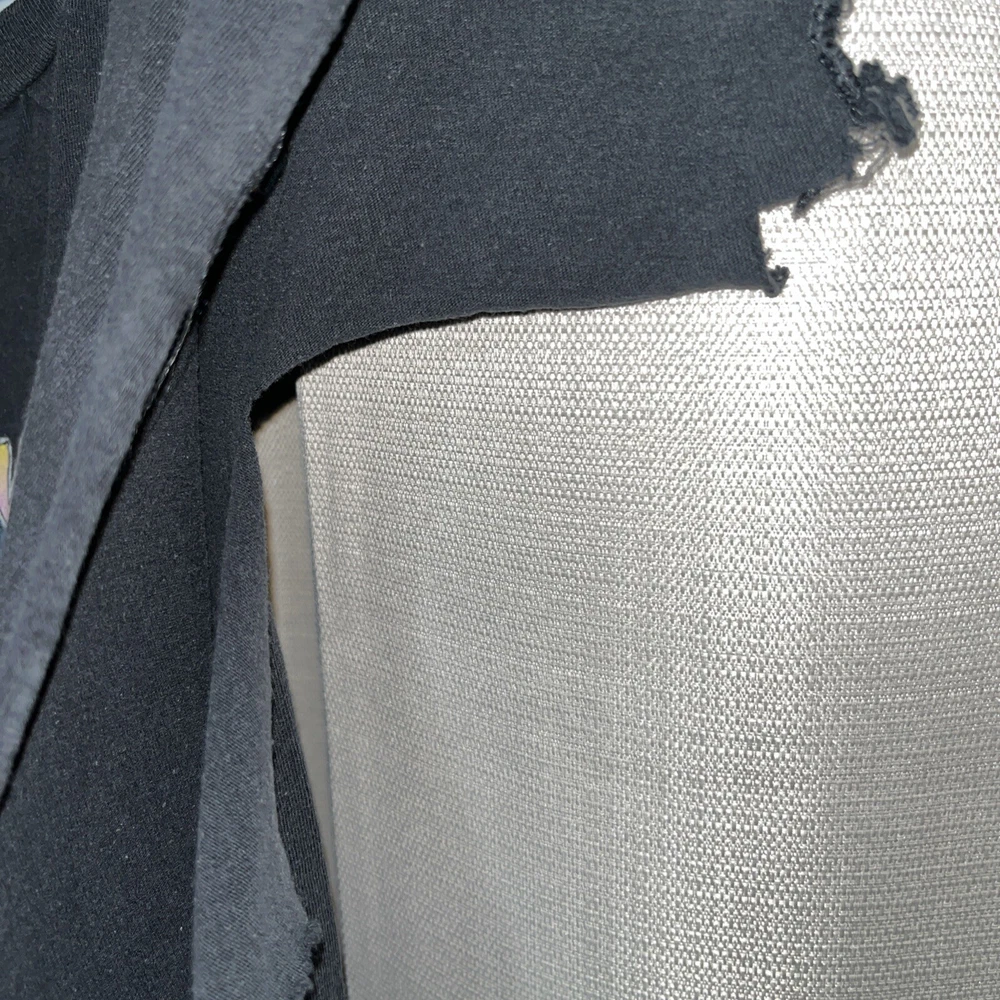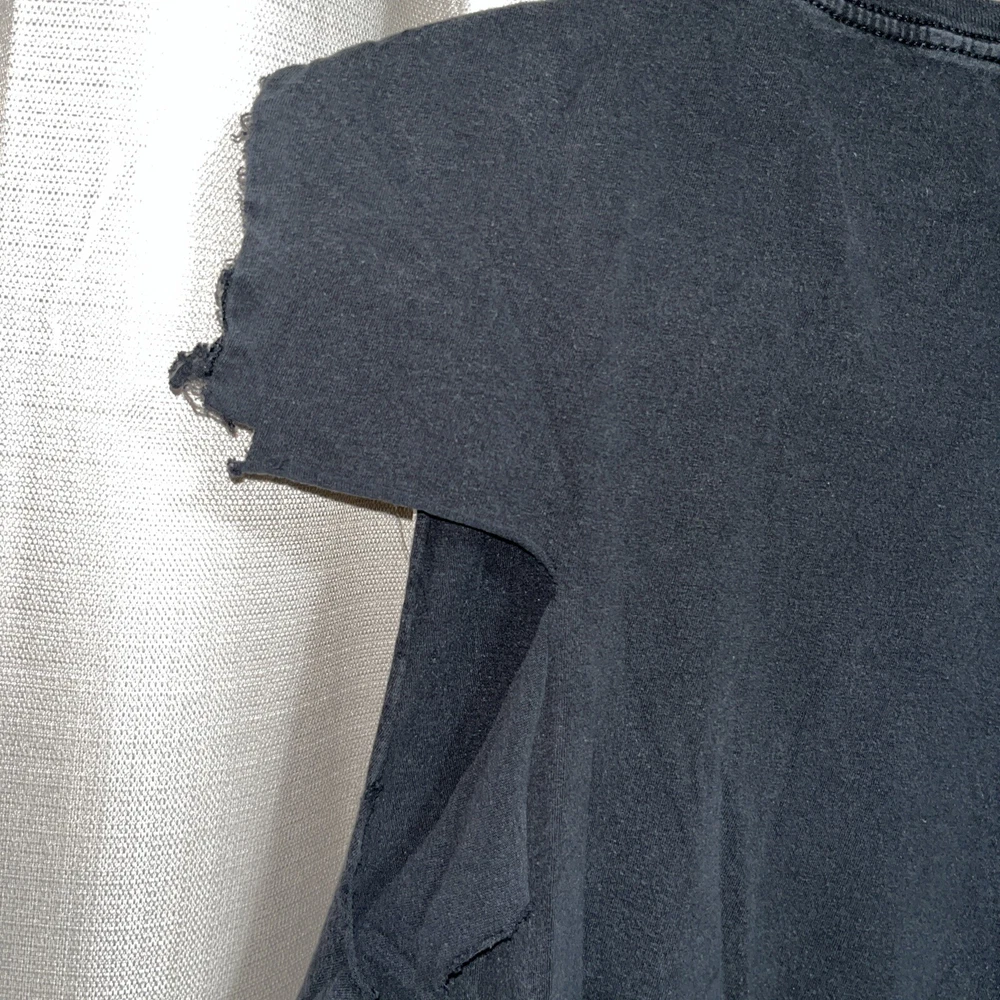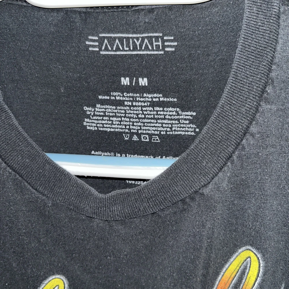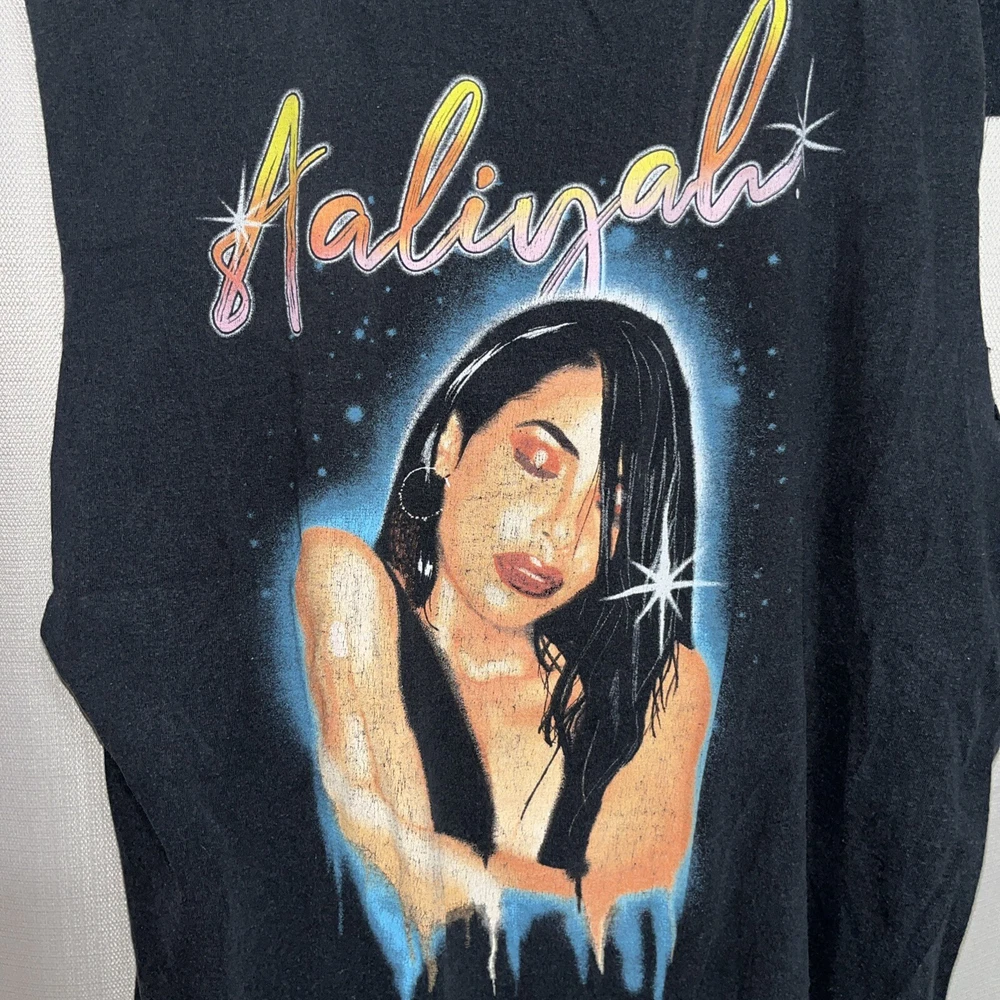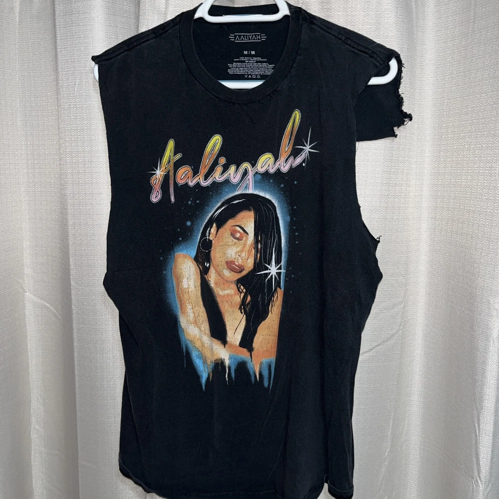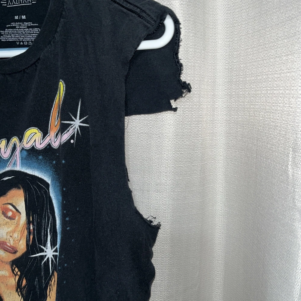 Women’s size medium Pretty cool Aaliyah graphic print t shirt Looks air brushed but it is not. Past owner cut the sleeves with scissors… unevenly cut but still looks cool. Just letting the buyer know. All cuts are pictured. Black tee. Angelish. Eyes closed. Peaceful.
