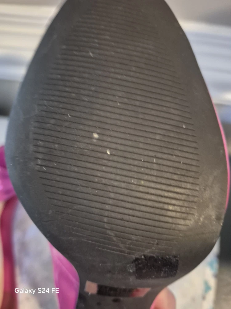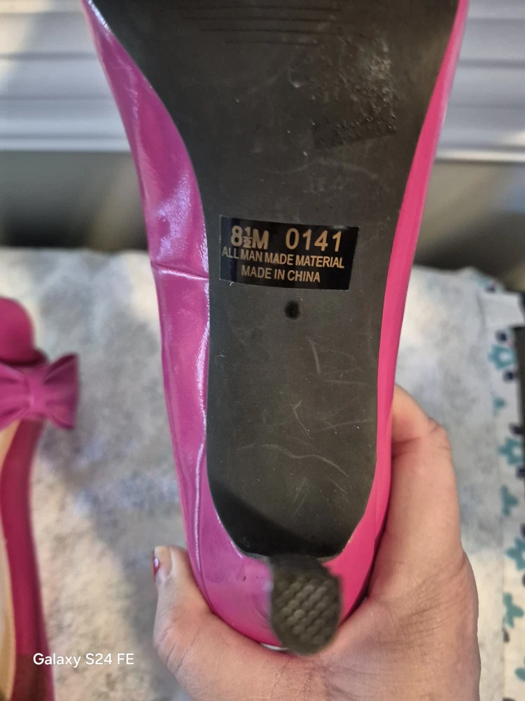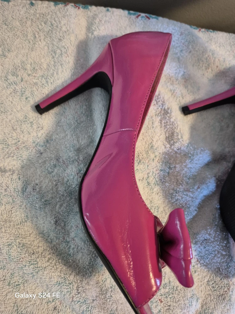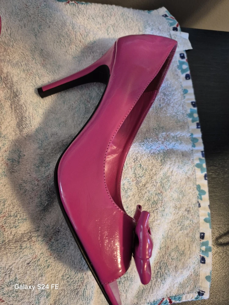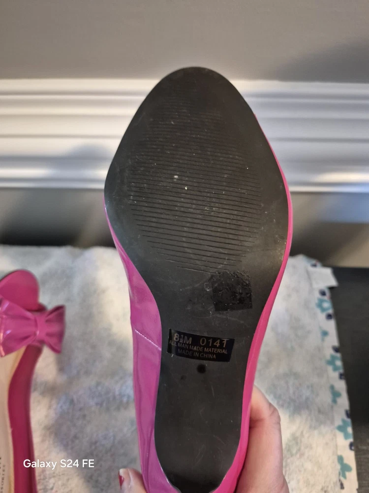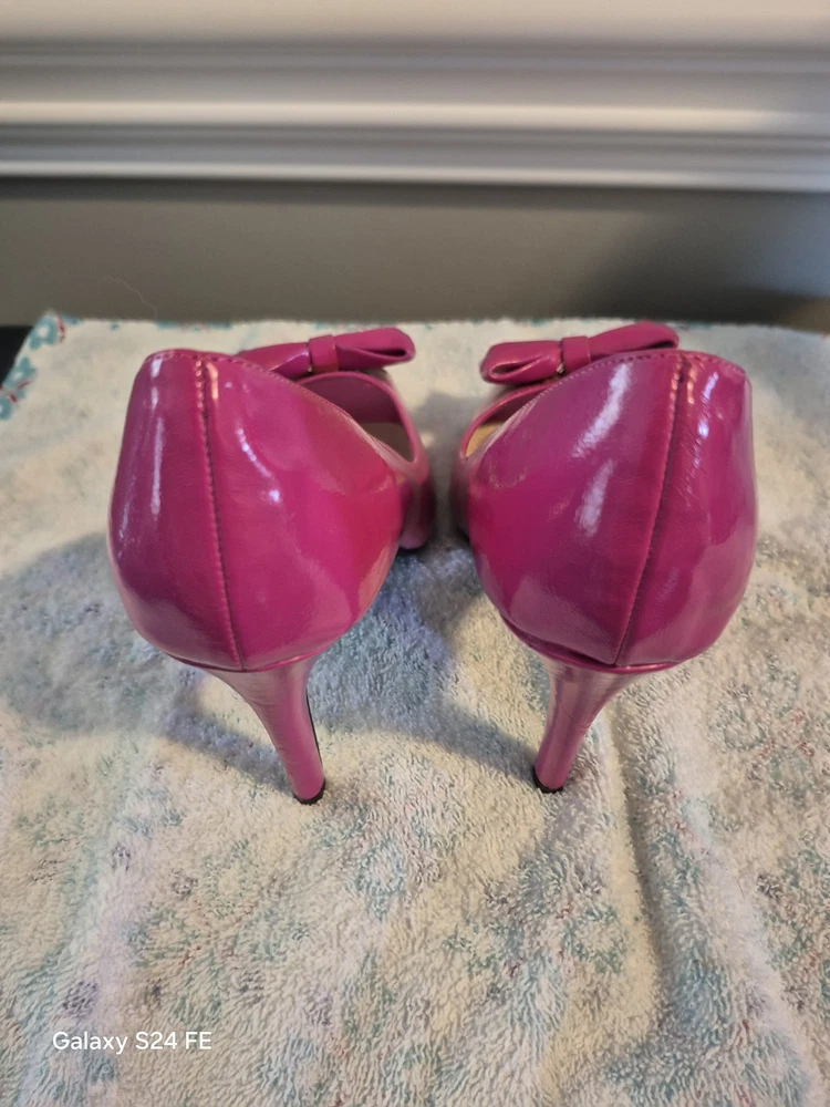 These are like new These are women's Versona peep toe heels in pink with a bow accent. They have a slip-on closure and a stiletto heel style. The upper material is polyurethane and the heel height is mid (2-2.9 inches). These shoes are suitable for party, cocktail, or business occasions, and they are available in size 8.5M. The toe shape is peep toe and the season is summer and spring