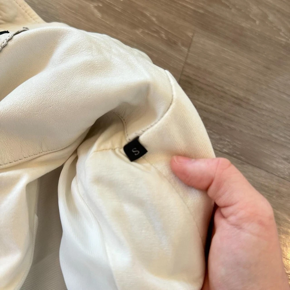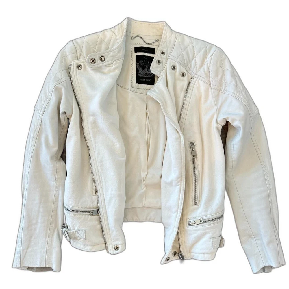 💌 Vintage Diesel leather jacket in a classic biker style 💌 Soft white leather with silver-tone zipper detailing💌 Quilted stitching on shoulders and upper sleeves💌 Asymmetrical front zip closure with snap collar💌 Two zippered chest pockets and adjustable waist tabs-✨In perfect condition✨ ✨Fall jacket; winter jacket✨✨Made with sheepskin leather✨ - Elevate your style with this stunning white leather jacket from Diesel. Crafted from high-quality sheepskin leather, this short-length biker jacket features long sleeves and a full zip closure. The jacket is accented with button, quilted, buckle, zipper, and logo details, making it a unique addition to your wardrobe. Ideal for travel, party, or casual occasions, this jacket is a must-have for any fashion-forward woman. The jacket is dry clean only and is available in size S. It is perfect for fall and winter seasons and is made in India. Add this vintage piece to your collection and make a statement wherever you go.