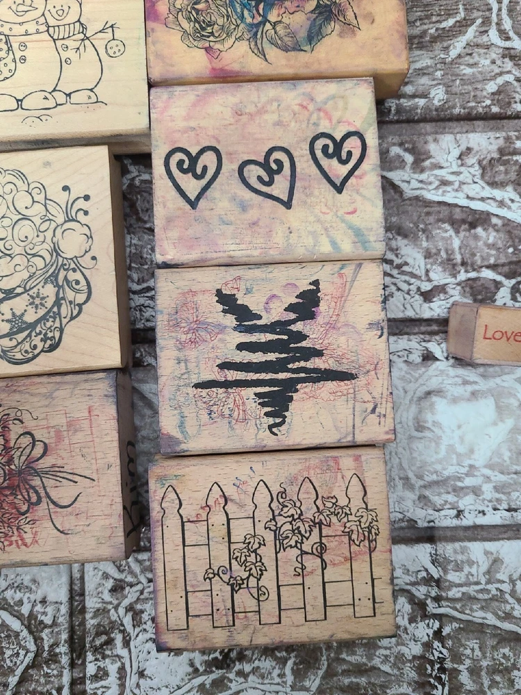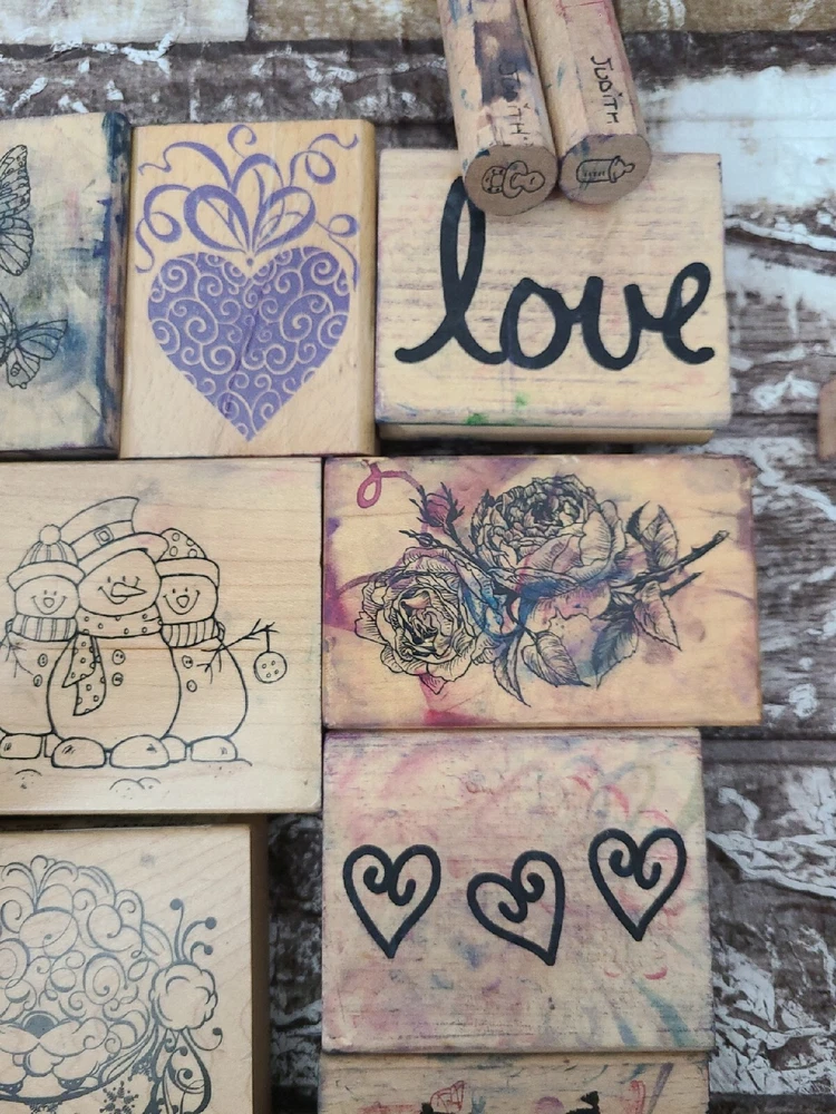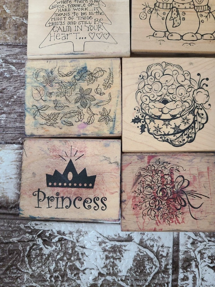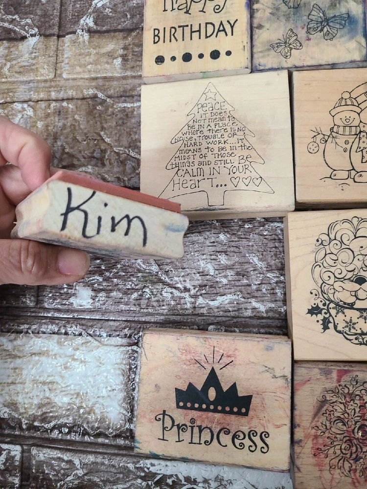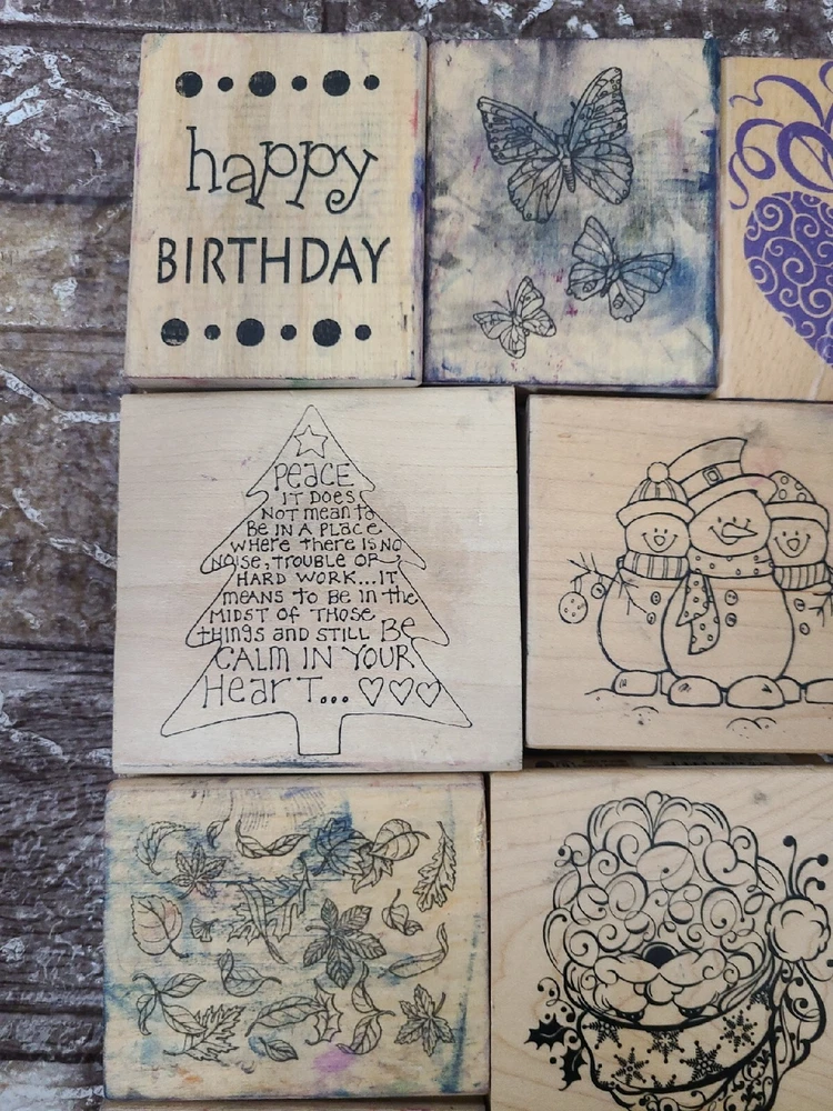 Wood Mounted Stamps Rubber Stamp Lot Of 17 Assorted Scrapbooking Craft Supplies. Some have names on side of stamps. Good preowned condition