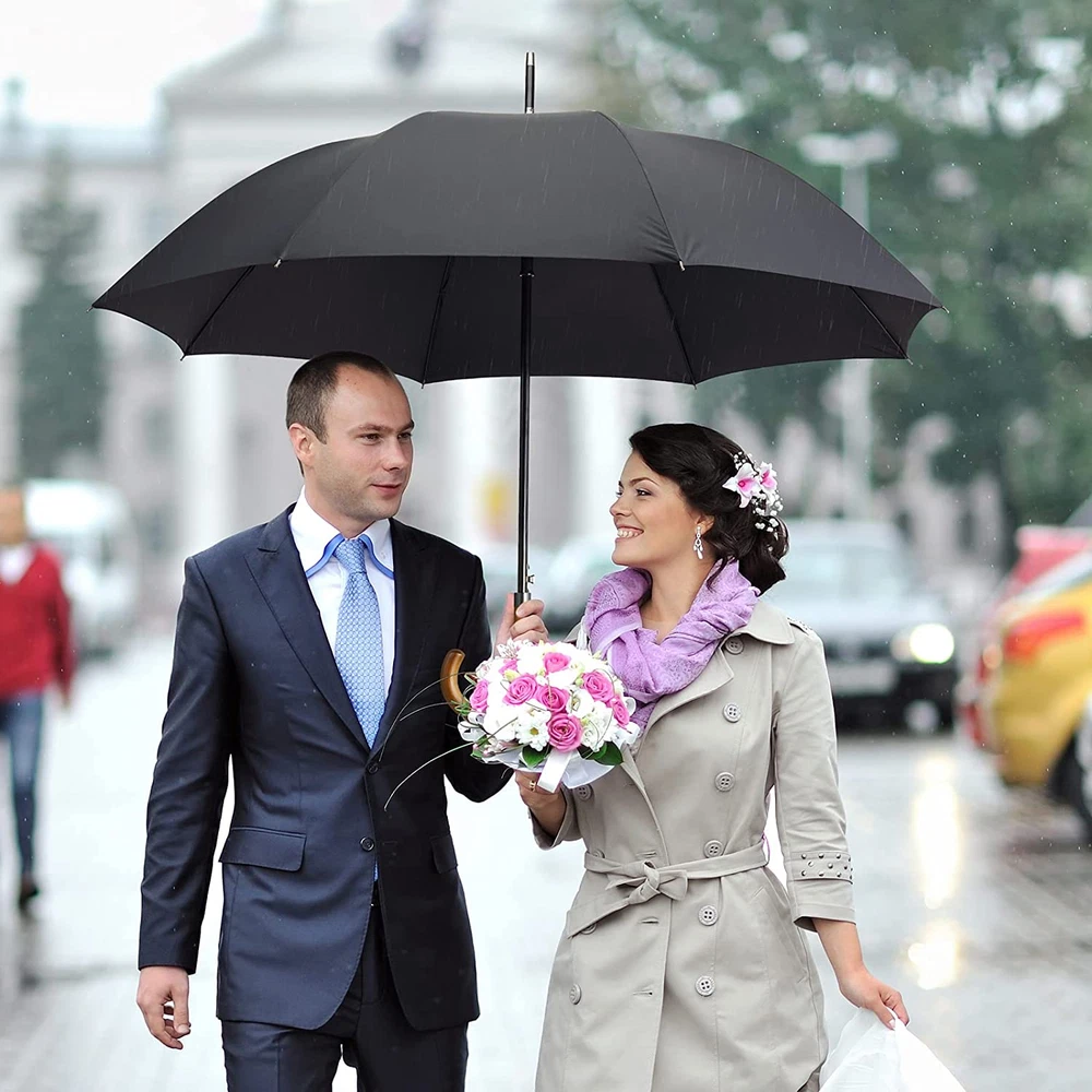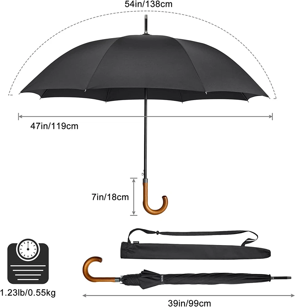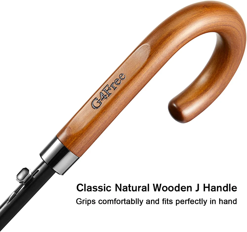 Wooden J Handle 54 Inch Large Auto Open Classic Windproof Rain Stick Umbrellas NEW | Fast & Free Shipping | Free Returns | Ships from US Color : Black Specific Uses For Product : Rain Recommended Uses For Product : All Weather Target Audience : Adult Special Feature : Auto Open, Water Resistant Shape : Round Handle Material : Wood Frame Material : Fiberglass Style : Classic Fiberglass frame Large Size Umbrella: 54 inch in arc canopy, 47 inch in diameter, this large stick umbrella provides sufficient coverage for two adults in rain. Each umbrella comes with a case for easy carry. Enhanced Windproof & rainproof: G4Free umbrella repels water for maximum rain protection with 210T high-density fabric. The improved 8 fiberglass ribs can be bent and flexed on windy days and are not easy to break. We use a windproof structure, even if it inverts with big storms, it will come back without damaging the frame of the umbrella. Auto Open with a stylish Wooden Handle: Classic stick umbrella with an automatic opening system at the touch of a button. The curved stylish wooden handle brings comfort and supports you while walking! Versatile Umbrella: transitions seamlessly from office, car to home. This umbrella is not only great for casual, but also formal occasions such as weddings, and graduation, keeping you dry and stylish. Buy with Confidence: This windproof golf size umbrella is constructed with strong fiberglass and rustless aluminum, which is flexible and durable. We stand behind the durability of our goods with strict craftsmanship and provide a of 12 months. Product Description G4Free Classic Series - Wooden J Handle Stick Umbrella Classic Wooden Handle: made of natural hard wood, grips comfortably Auto Open Button: simply open the umbrella at the touch of a button High-density Waterproof Fabric: keep you dry and fully protected Versatile Umbrella: great for casual and formal occasions such as weddings and graduation Sturdy Metal Peak Sturdy metal umbrella hat with good wear resistance. It can be used as a walking stick when it stops raining. Auto Open Button Simply press a button to open the umbrella with one hand. And the details made of metal add visual unity to the umbrella. Durable Metal Tips Durable tips support the canopy firmly with the fiberglass ribs. And the metal color matches the classic style of this umbrella. 210T High-density Waterproof Fabric 210T water-repellent fabric is resistant to heavy rains to keep you dry and fully protected, and allowing the umbrella to dry very quickly.