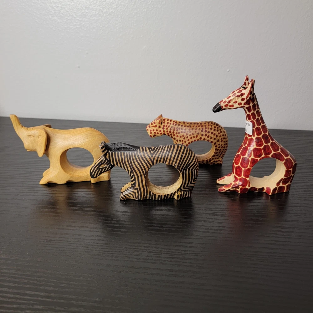 Number in Pack:4Brand:HandmadeType:Napkin RingTheme:Animals, SafariMaterial:WoodCountry/Region of Manufacture:KenyaOccasion:MultipurposeColor:BrownMPN:Does Not ApplyFeatures:Hand Carved