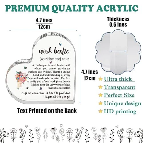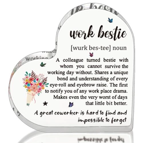 30 Days Return Policy Fast Delivery Trusted seller Work Bestie Gifts for Coworker Friends Work Partner, Work Bestie Definition Work Bestie Birthday Gifts, Friend Gifts for Work Bestie Friend at Work Decorative Signs Product Description 【Funny Work Bestie Gifts】: Our special gift for your work bestie to express everything you want to say for work bestie. This lovely work bestie presents is a good choice, it can make her remember your time together. Work Bestie Gifts For Women Coworker, Funny Work Bestie Gifts, bosses day gifts for Work Bestie, Work Bestie Definition Gift For Women Coworker, Best women Coworker Gifts Friend Gift Work Friendship Gift Birthday Gift for Work Bestie work wife, work bestea, work Friends, friend at work, bestie coworker. 【Friend Gift for Work Bestie】: Perfect friends at work plaques for work bestie, great for adding fun to various occasions. Work bestie gift ideas for birthday, friendship gift for Work Bestie, Work Bestie moving away, Work Bestie leaving, Work Bestie farewell, Work Bestie going away, going away present for a friend at work, gift for office work friend, friend leaving work gift, wedding gift for work friends, thank you Work Bestie, Christmas wedding anniversary gift for Work Bestie, bridal shower gift for Work Bestie, Work Bestie retiremen etc.. 【Office Gifts for Work Bestie】: A colleague tured bestie with whom you cannot survive the working day without. Shares a unique bond and understanding of every eye-roll and eyebrow raise. The first to notify you of any work place drama. Makes even the very worst of days that little bit better. Work made us coworkers but the fun and laughter made us friends, a great Work Bestie is hard to find and impossible to forget. 【Unique & Thoughtful Design for Work Bestie】: This acrylic heart shaped sign is printed with meaningful text and unique design. It reminds your work bestie how important your friendship is to you. The printing is bold and clear, not easy to fad, lasts longer than flowers and chocolates. Suitable for various occasions and favorite places, such as desks, bookcases, coffee tables, wall cabinets and nightstands etc. It will bring a good mood and memories to your work bestie day and night. 【Material and Size】: This Work Bestie plaque is made of highly transparent acrylic, crystal clear, eye-catching, carefully polished, smooth surface, durable, not easy to break. It measures approximately: 4.7 x 4.7 x 0.6 inches, and is a perfect size for placing on any tabletop etc.. Shipping Returns Payment Shipping Shipping is FREE to all addresses other than APO/PO boxes in the lower 48 states. All our stock ships from US-based warehouses. Shipped via USPS or UPS (depending on location and package weight) Unless stated otherwise, all orders will ship within 24-72 hours of your payment being processed. Check our feedback to see the great reviews of FAST shipping we offer. Returns As our valued customer, we will do our best to make sure the product you receive arrives to you on time and as expected. If you are not satisfied with your purchase, please contact us within 30 days of receiving your order to process a return. Payment We currently accept payment via eBay managed payments only. Once payment is cleared, we will dispatch your shipment within 1-3 business days. Please refer to the "Shipping" tab for more information regarding shipping speed to your destination.