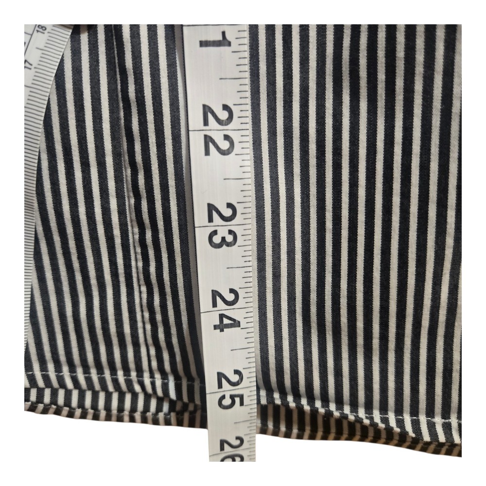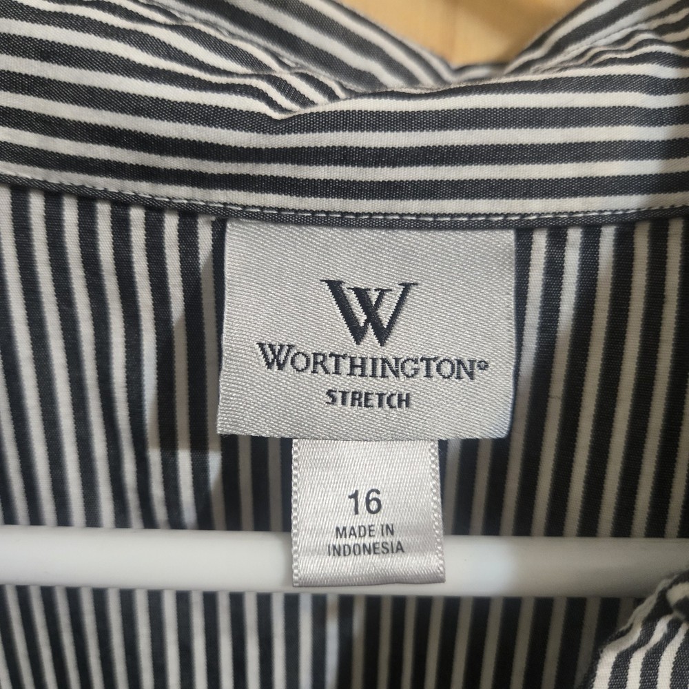 The Worthington Button Stripe Blouse in size 16 features a stylish design with a V-neck, long sleeves with French cuffs, and a button closure. Made from a comfortable cotton blend fabric, this blouse is perfect for casual, workwear, or business occasions. The multicolor striped pattern adds a classic touch to the basic style, making it suitable for all seasons. Machine washable and with a regular fit, this blouse offers both style and convenience for the modern woman.