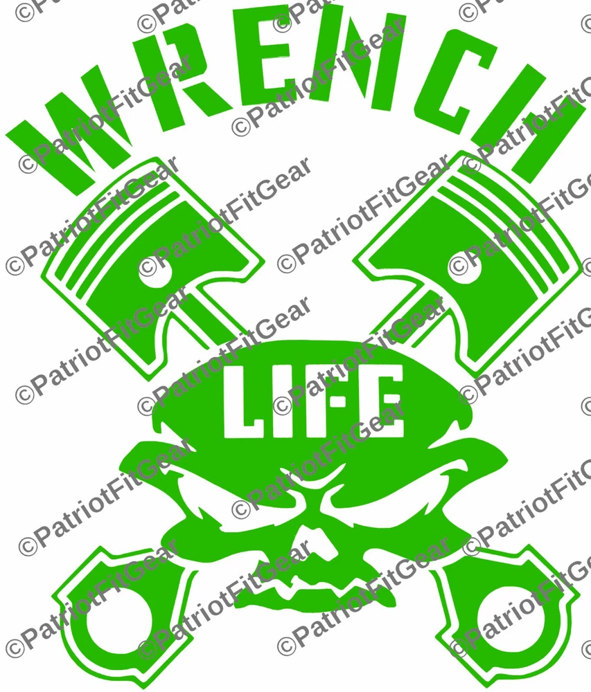 Wrench Life,Mechanic,Gear Head,Wrenching,Skull,Pistons,Stickers,Vinyl Decal PatriotFitGear SIZE IS Aprox 5"x6" If you need a different size please ask. Decal is Vinyl Cut so it will be one single color. The vinyl is 3MIL, resistant to Sun, Rain, Snow & Sleet. The decal will stick to any hard, smooth surface and are suitable for wet locations (Boat, Car, Car Window, Laptop, Instrument Cases, Snowboard Decks, School Lockers, Mirrors, etc.) An application (transfer tape) overlay allows for precise and easy placement. All decals are computer cut and are customizable. HOW TO APPLY STEP 1: CLEAN THAT AREA GOOD! First make sure you have a dry place and no wind to install your decal. Make sure to prep the area, this is the most important part of installing a decal! If you put your decal or sticker on a dirty surface, it will just pick that dirt and grime up like a lint roller does your shirt, those aren't so sticky after you use them are they! So let’s make sure the area is nice and clean so that it can adhere to where you are going to place it. You can use soap and water, rubbing alcohol, or any other fast drying cleaner. My favorite is rubbing alcohol since it dries by itself within seconds and leaves no residue behind. On that note, do NOT use anything like Windex or other household spray cleaners that leave a residue behind or oily substance, that defeats the purpose and will cause your decal/sticker not to adhere to the best of it capabilities. STEP 2: DECIDE AND PEEL ! After you have cleaned your car, you now need to decide where you want to center your decal in the area you cleaned. I use a measuring tape to measure from different spots on the car to make sure I have it exactly where I want it and that it will not turn out crooked. When I measure I use a piece of masking tape to mark the measurements, normally four for left/right/top/bottom. Then I have a somewhat boxed area to force me to place the decal where it should go. Be aware after you stick it, you might cannot undo it and use it again, since it can separate the design or text from each other. After you decide where you want it, go ahead and start to peel your decal back, if it doesn't stick to the transfer tape the first pull, replace the transfer tape and push it together with your fingers or use a credit card to press together. STEP 3: PLACE THAT DECAL! So you cleaned your area and also decided how and where you are going to place your new decal or sticker and you made sure your decal can peel apart easily. FOR SMALLER DECALS - Now fully peel the decal off the backing and hold it on the tips of the masking/transfer tape. Try not to touch the back of the decal itself since it could leave dirt on your decals back side. You should have each hand holding the furthest corners from each other and keep it tight so that the decal does not fold in on itself. Place one end of the decal down and then smooth it out to the other end till the decal is fully placed. FOR BIGGER DECALS - Do not fully remove the backing on your decal. You will want to remove about 1/3 of the backing and start by applying that 1/3 of the decal to the car. Then slowly pull more of the backing off while at the same time apply the decal to the car until you have fully installed the decal. Either work left to right or right to left, which ever you feel best doing. Don't forget you can always buy a $1 spray bottle at your dollar store, put ONE small drop of soap in it and fill with water and shake. Then LIGHTLY (I MEAN LIGHTLY) spray the area and then apply the decal. This is only suggest for bigger decals or decals that you need to be in a precise area. STEP 3: THE HARDEST PART! Waiting... yes this is the hardest part, because most people are so impatient that they can't wait and they mess up the decal by removing the transfer tape too early! The best way to allow your decal to dry is out in the sun, having it in the shade or in a cool place will only make it take longer. If you used a mist of soapy water when installing your decal and do not let the sun dry it, then it will take a very long time before it adheres correctly, since nothing is there to remove the water and dry the decal to the surface. Do not try and rush this buy using a heat gun, you can melt the transfer tape and vinyl and when you peel it, it could cause the decal to stretch with the transfer tape. Again the best way is the sun. Finally just give the decal 30 minutes before you remove the transfer tape, go inside and eat lunch. By the time you’re done you should be able to go back outside and finish your decal and be in a good mood from that great lunch and nice cold sweet tea! If your decal is still not sticking, make sure you got it in the sun and it is warm outside, and just give it a bit longer. After ~30 minutes to dry, remove transfer paper.