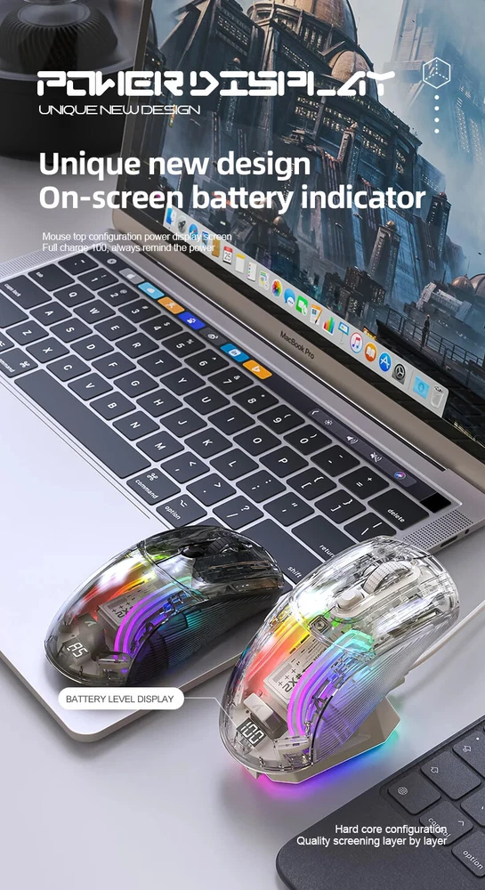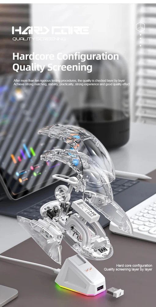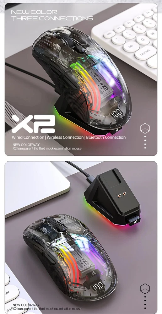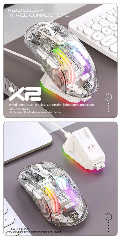 X2 Pro Magnetic Charging Bluetooth Mouse, Tri-Mode , RGB Lights, Transparent, Battery Indicator, Computer Phone X2PRO wireless mouse introduction: Product interface type:USB-Type-C Product connection method: USB, 2.4G, Bluetooth Product optical sensor: original phase 3212 Lighting effect: 11 kinds Frame rate (IPS):60IPS Maximum acceleration (G): 20G Refresh rate (FPS):4000FPS DPI:1200(Default)-1600-2000-2400-4000 Battery capacity:500mA polymer battery Charging current:280mA Charging voltage: 5V Product size:126.3*62.5*38.4mm