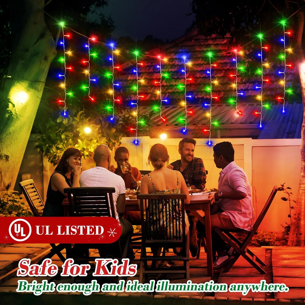 XURISEN 640 Xmas LED for Christmas Decoration Multicolor Christmas Decoration Ice Lights: These Ice String Lights are 66ft long with 120 drops, and they feature 640 quality crystal clear led lights.You can connect extra 66ft long strip for larger decorating projects too.HANGING FROM ROOF LINES, PORCHES FENCES AND RAILINGS,IT WILL INSTANTLY TRANSFORM YOUR DECORATED SPACE INTO FUN, RELAXING, COZY AND FESTIVE. 8 Lighting Modes: You can choose from 8 different lighting modes (Combination, In Waves, Sequential, Slo-glo, Chasing/Flash, Slow Fade, Twinkle/Flash, and Steady On.) for an extra festive display.CUSTOMIZE YOUR OWN MOOD LIGHTING,MAKING THE HOLIDAYS SPECIAL THIS YEAR WITH SOME BRIGHT LIGHTS AND COLORFUL CHEER. Timer and Memory Function: The outdoor Christmas lights built in timer function:6 hours on 18 hours off.Memory function can recover from the previous setting mode when you restart. Plug the led outdoor christmas lights into an outdoor timer, preferably one that automatically turns on when it gets dark out. UL Listed For Outdoor: XURISEN brand Christmas fairy string lights are IP44 waterproof and built to stand up against harsh environmental elements while maintaining safe connections.NOVEL AND CLASSIC DESIGN,IT’S PERFECT FOR DECORATING CHRISTMAS,NEW YEAR,ANNIVERSARY, BIRTHDAY ,VALENTINE'S DAY, WEDDING,ETC. High-End Christmas lights: The 8 modes are carefully designed to provide a variety of choices while greatly reducing energy consumption. The timer function precisely controls the time of use, realising the efficient use of energy and contributing to sustainable development.