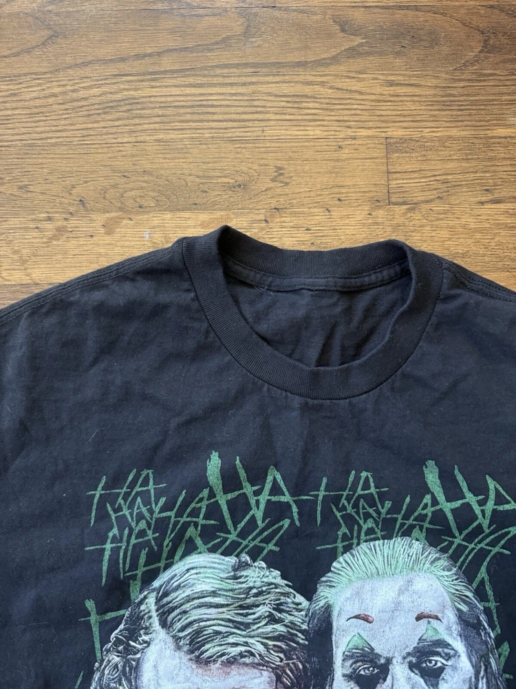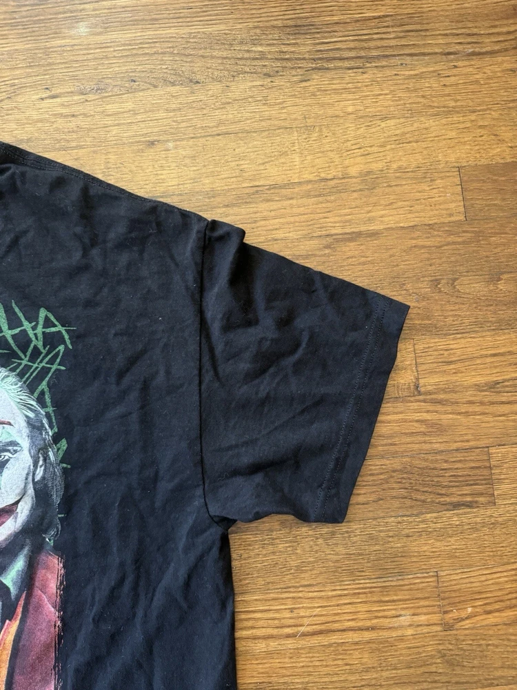 Get ready to laugh out loud with this Y2K 00s Joker Ha Ha Ha T-Shirt. Featuring Batman's iconic Joker character, this shirt is perfect for any fan of the classic comic book. Made from comfortable cotton material, this shirt is easy to care for and can be machine washed. The shirt is a size XL and has a regular fit, making it a great choice for any man's wardrobe. The black color and multicolor design make it a versatile choice for any season. Whether you're looking to show off your love for the USA or just want to add a unique piece to your collection, this shirt is sure to turn heads.