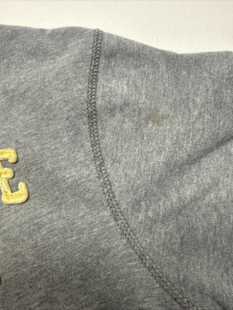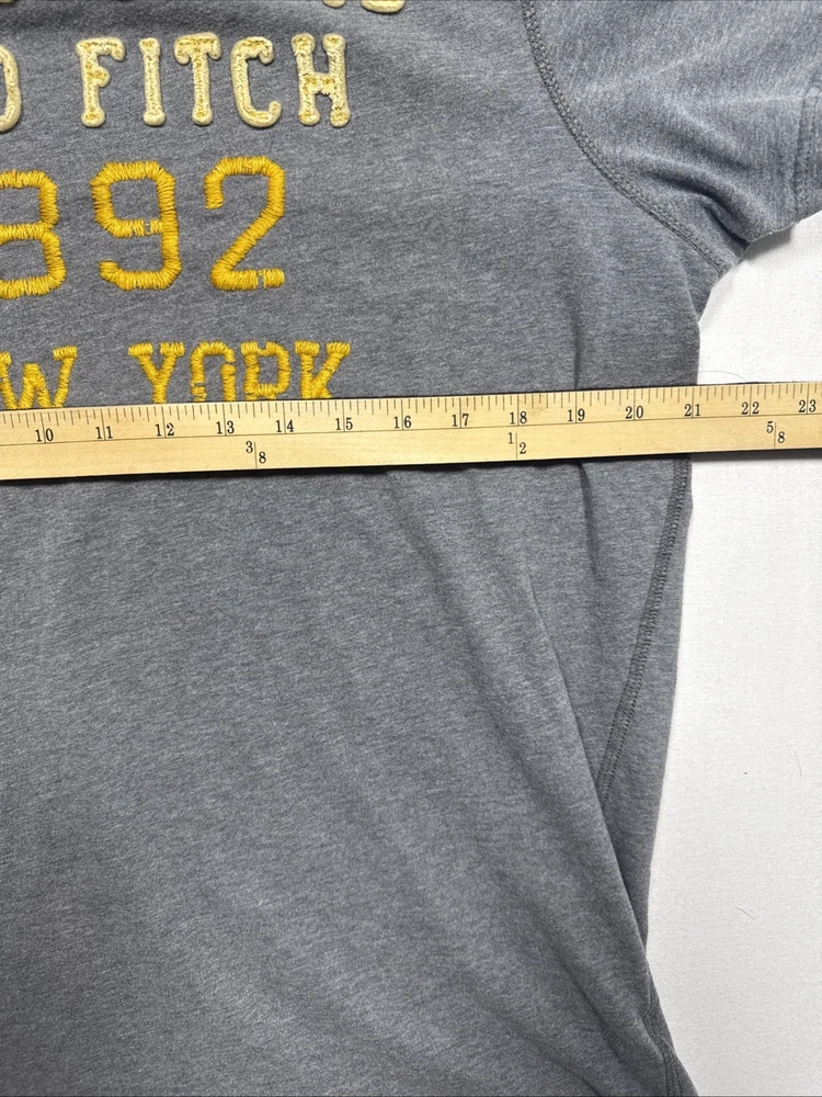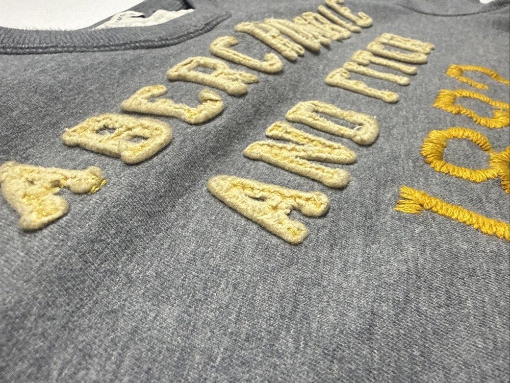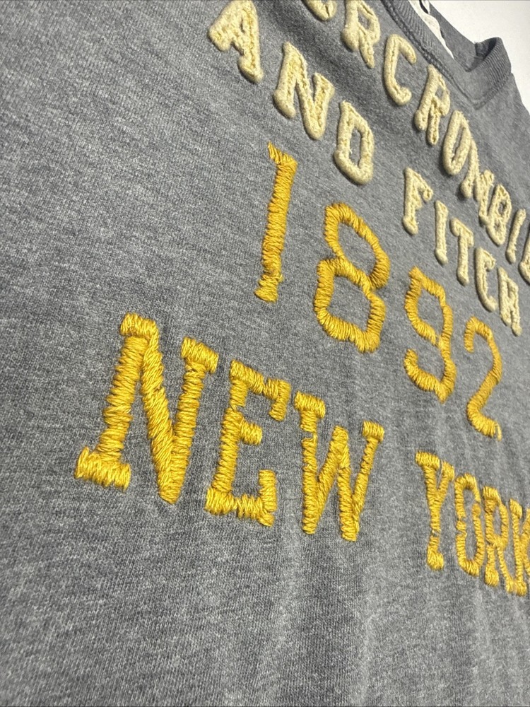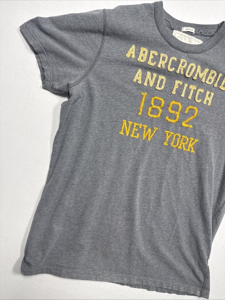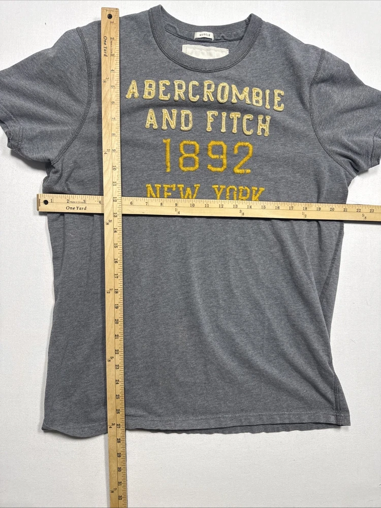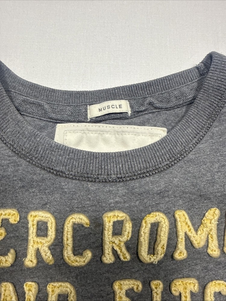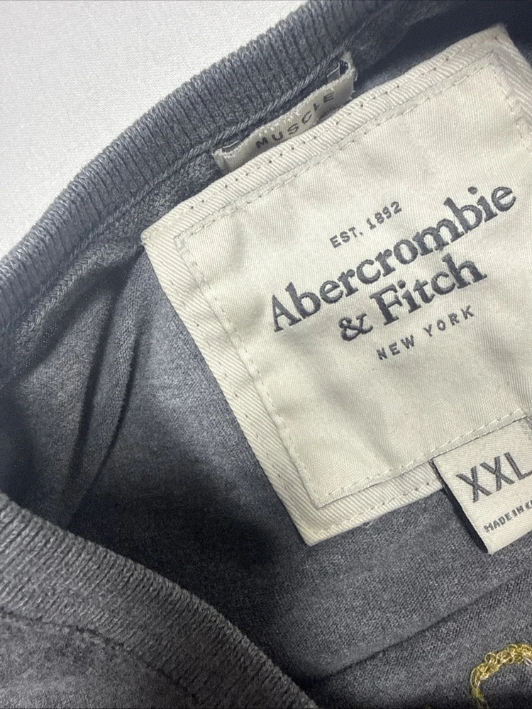 Some stains (see photos). Still, very collectible. Measurements in the photos. The Y2K Abercrombie & Fitch Muscle T-Shirt for men in XXL size is a classic piece with a grey color and graphic logo spell out in felt. Made of cotton, this short sleeve shirt features a crew neck and is designed for easy care, lightweight, and breathable wear. Perfect for all seasons, this shirt is a stylish addition to any wardrobe, representing the iconic Abercrombie & Fitch brand with a solid pattern and logo accents.