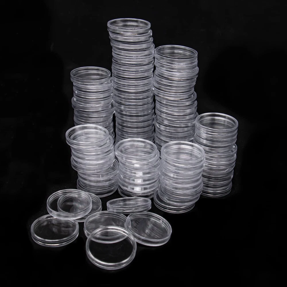 100 Pack 30mm Clear Round Coin Capsules with 5 Sizes Protect Gasket The coin storage box contains 100pcs 30mm round coin boxes , a transparent plastic storage box, 100 pack black EVA foam gaskets ,which is very suitable for storing, protecting and displaying coins. 30mm clear round coin capsule with internal dimensions of 30 x 3 mm and external dimensions of 33 x 5.5 mm; 5 sizes of EVA foam gasket can hold the most popular coins, 17/20/25/27/30mm, easily separate the foam ring from the EVA foam pad according to the size of the coin, prevent the coin from sliding and scratching. The outer edge of each coin round box has a crescent-shaped opening, which is easier to open, has good sealing, and is not easy to fall off, which can protect the coins more safely. Note: The product may have raised burrs during the production process, which are not quality problems, you can use sandpaper to lightly polish them to solve them