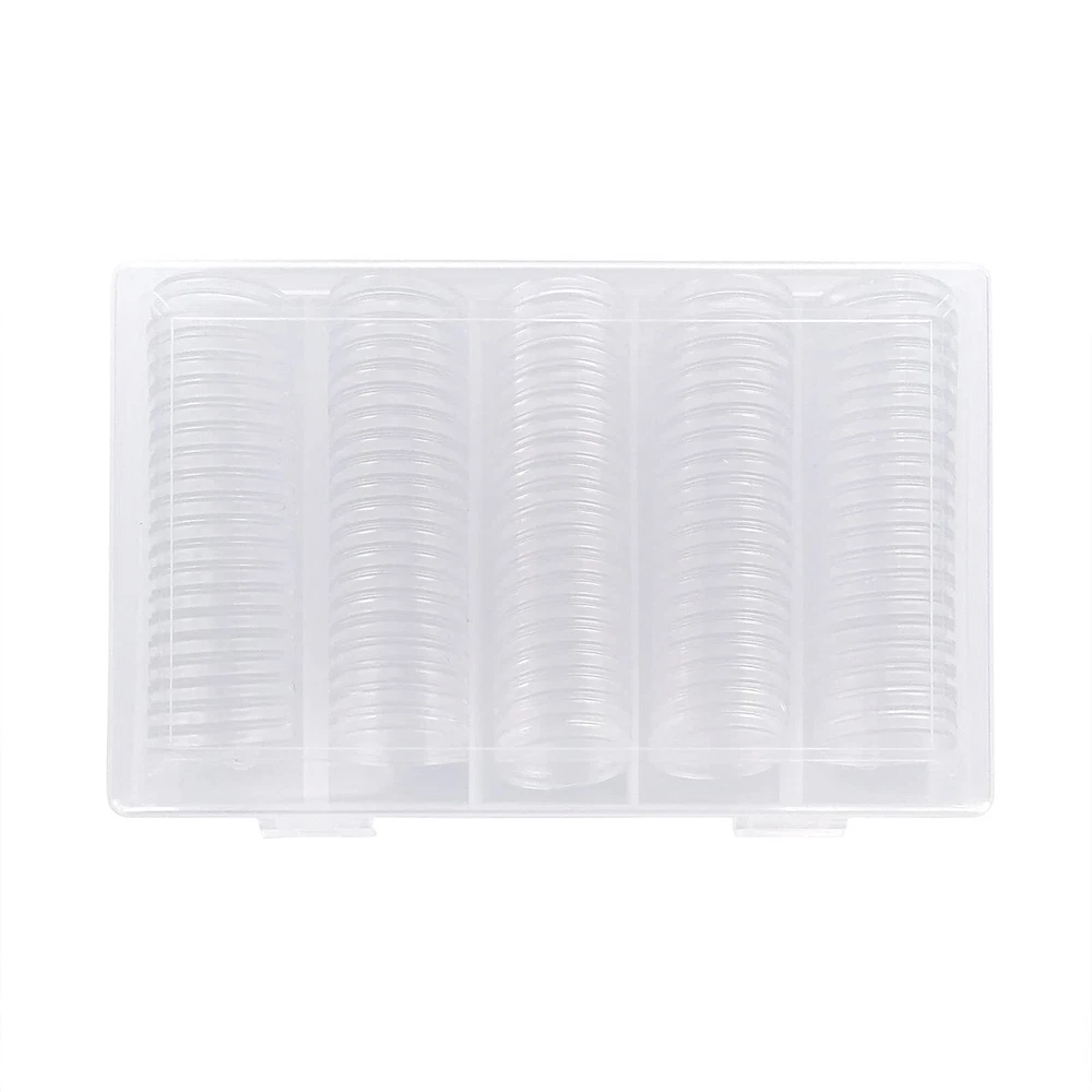 Specification: Material: Plastic Coin box size: 25mm Plastic storage box size: 16.7 * 10.5 * 3.5 cm Color: transparent The package includes: 100 * coin box 1 * plastic storage box The coin storage box contains 100pcs 25mm round coin boxes, a transparent plastic storage box, which is very suitable for storing, protecting and displaying coins. Made of high-quality plastic, high transparency, smooth surface, you can see the coins inside, and can effectively protect the coins from dust and oxidation. The outer edge of each coin round box has a crescent-shaped opening, which is easier to open, has good sealing, and is not easy to fall off, which can protect the coins more safely. The storage box size is: 16.7*10.5*3.5cm. The size of each coin box is 25mm. Note that half dollar and dollar coins cannot be placed.