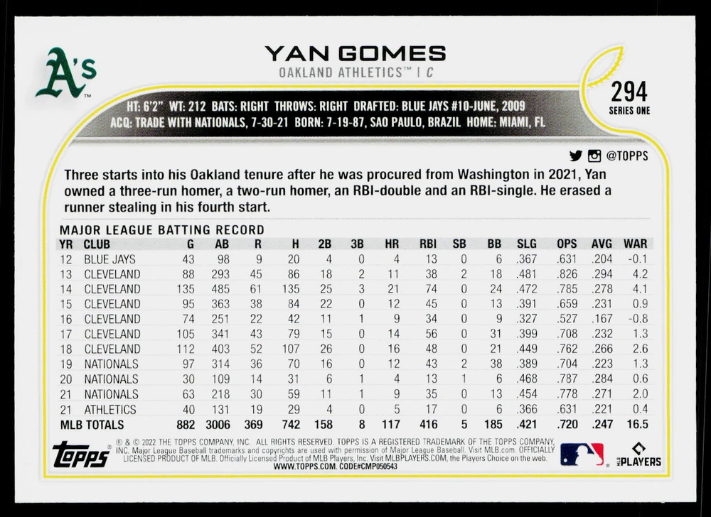 You will receive a , Yan Gomes 2022 Topps #294 Oakland Athletics Near Mint or Better condition. Please note i am not a professional card grader the condition of raw cards can be very subjective. Please refer to the high quality pictures to determine condition yourself any questions at all please feel free to ask!! we take pride in the quality of cards we sell and ship, all cards will be shipped in a penny sleeve and top loader for added protection. be sure to save us as a seller, as we are growing and listing daily THANK YOU FOR YOUR BUSINESS