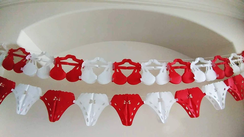 Yani’s Gifts Lingerie Party Decorations, Bra and Panties Tissue Paper Streamers Banner, 1 Bra and 1 Panty, Each Over 8.5 ft Long, Stag Party, Hen Party, Final Fiesta Bachelorette Party, Bridal Shower Package includes Two 8.5 ft banners, One Bra Banner and One Pantie Banner with a red and white assortment of tissue paper panties and bras perfect for your Bachelor or Bachelorette Party. ONE BANNER EACH of Panties and Bras, each over 8.5 ft long, Total over 17 ft of Party Decorations SEXY PANTIE GARLAND- 15 Panties, a Red and White assortment, each 17.5 cm x 22 cm (6.8 in x 8.6 in) NAUGHTY BRA GARLAND- 15 Bras, a Red and White assortment, each 20 cm x 24 cm (7.8 in x 9.4 in) HANDMADE LINGERIE PARTY DECORATIONS made with fine tissue paper. Despedida de Soltera Decorations NO ASSEMBLY REQUIRED, just open and hang up the light weight Mexican Bachelorette Party Decorations Shipping from the USA All of our products are shipped from the USA, ensuring quick delivery to your destination. Payment We offer the following payment methods: PayPal, credit card, bank transfer, and eBay's secure payment system. Free Shipping & Free Returns Shipping within the USA is FREE. Additionally, any return is absolutely free for you. Risk-Free Purchase You have the option to return an item within 30 days without any justification. We cover the return shipping costs! Fast Shipping We ship immediately upon receipt of payment. Generally, the package is delivered within 2-3 days in the USA. If it takes longer, we will contact you. Quality and Costs Made in Europe, USA, China No customs fees or additional charges Total satisfaction guarantee Invoice with declared VAT available upon request in .pdf format Feedback Your feedback is very important to us. After you pay for your purchase, you will automatically receive positive feedback from us.