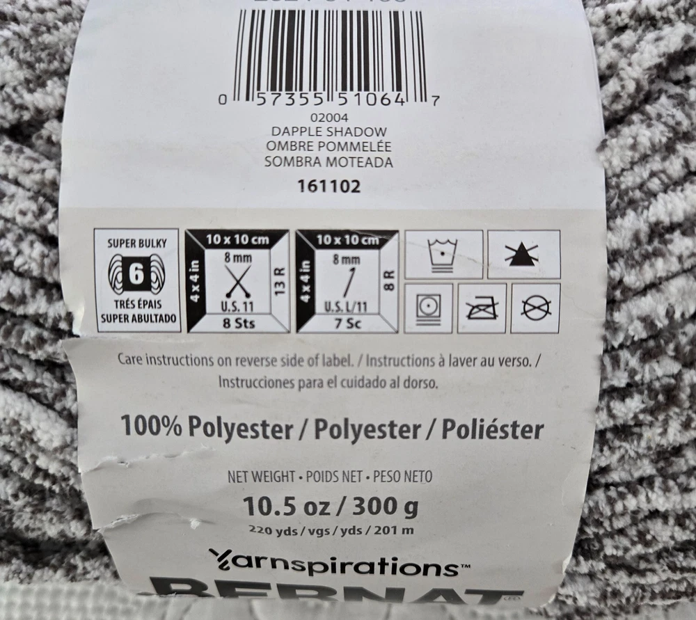 Elevate your knitting and crochet projects with the cozy Yarnspirations Bernat Blanket Speckle Yarn in the soothing Dapple Shadow color. Each skein is a generous 10.5 ounces, perfect for creating warm and inviting blankets, throws, and other home decor. The super bulky style of this yarn allows for quick progress on your projects, ensuring you can craft your creations with ease and speed. Crafted from high-quality polyester, this yarn promises durability and softness that's gentle on the skin. Ideal for a variety of applications, it's suitable for accessories like bags, hats, gloves, and scarves, as well as baby and toddler items, bed linens, and crafts. With Bernat's reputation for quality and Spinrite's dedication to craftsmanship, this yarn is a smart choice for any creative endeavor.Thanks for looking!!