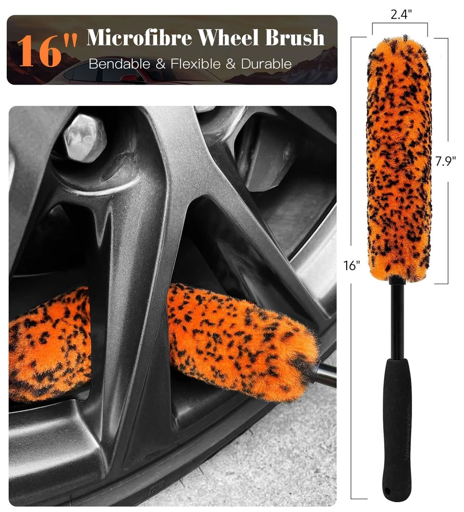 WHEEL BRUSHES FOR CLEANING WHEELS: Our 360° Bendable wheel brush for car detailing are suitable for all shapes of wheels or spokes cleaning, the large brush measures length is 16 inch, the diameter is 2.4" wide, the small one has the same 16"-length and diameter is 1.4" fibers. DEEP CLEANING: Our wheel brush kit equipped with boars hair detailing brush, differ from other brushes with hard PP bristles, our detaing brush set made of premium boar bristles, which are more delicate to clean without scratches, the elbow connector is easy to reach narrow or tight space. EFFICIENTLY & QUICKLY: YeewayVeh rim brush is made premium soft synthetic wool fibers, the longer bristles than others can help penetrate deep entire inner barrel of the wheel for quickily thorough cleaning, tire brushes for cleaning tires is a convenient way to keep your rims clean. ERGONOMIC FOAM GRIP: Car wheel brush with ergonomic EVA foam grip, comfortable and effortless, rim cleaning brushes designed with rubber lid for fiber stable and durability, it pairs perfect with a nice degreaser or wheel cleaner. WHAT YOU GET: The package included 1 x 2.4-inch diameter Bendable wheel Brush, 1 x 1.4-inch diameter Bendable Rim Brush, 1 x Detailing Brush. wheel cleaning kit is the entry level brushes for tire maintenance and makes cleaning wheels easier and faster.