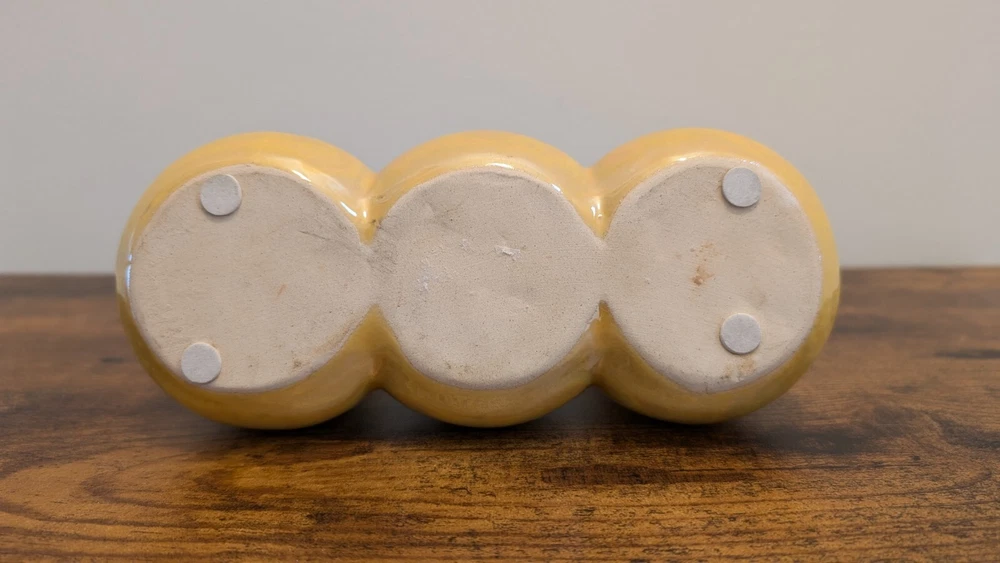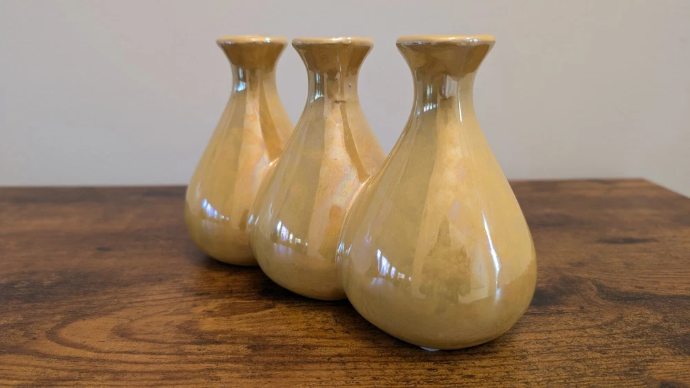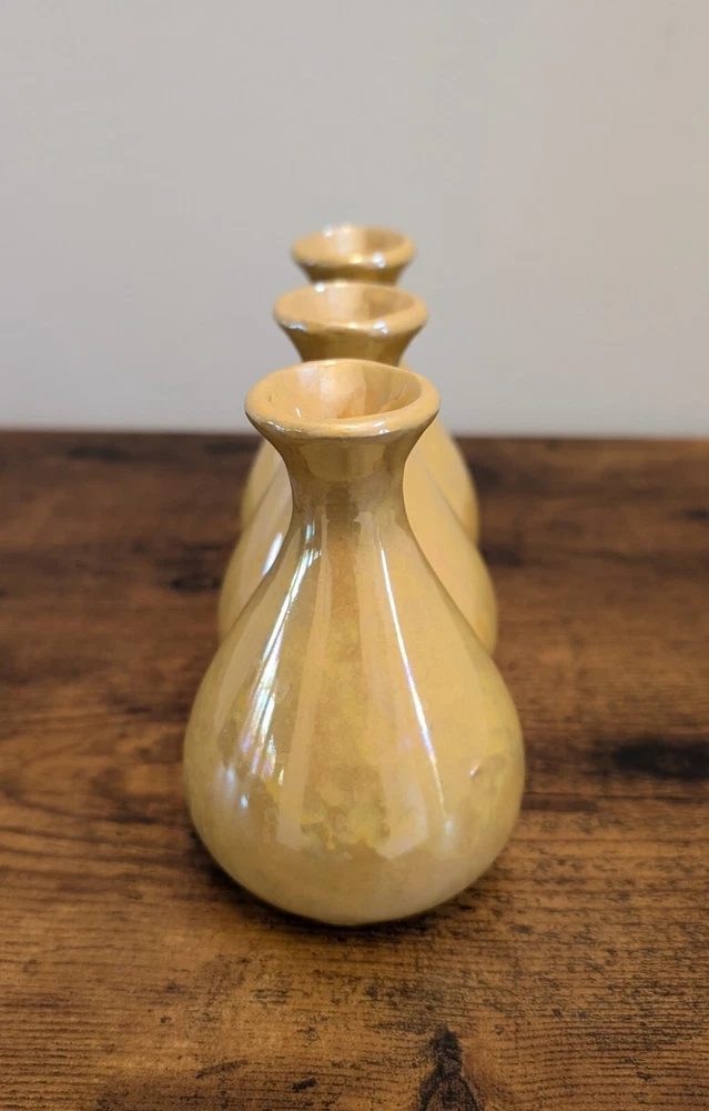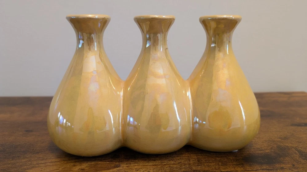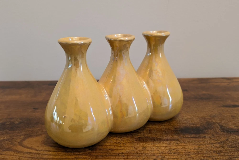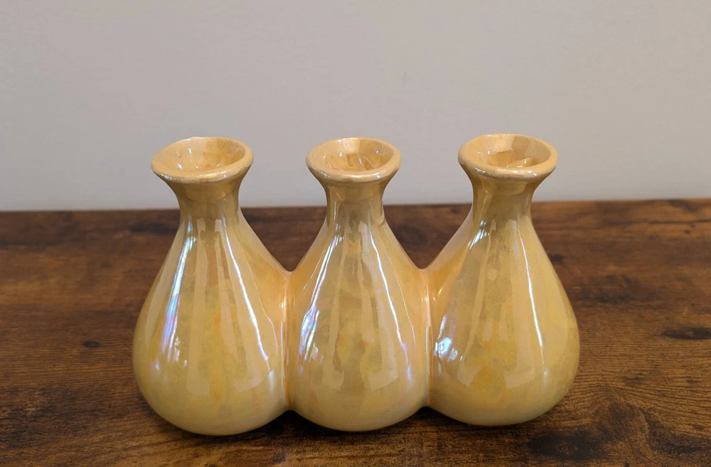 Yellow Luster Triple Bud Vase, Ceramic Retro Iridescent (8" w x 5" h)